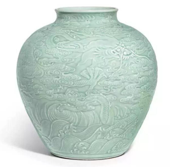 这件是乾隆粉青釉浮雕苍龙教子图罐,乾隆性格好大喜功,喜欢比较浮夸的东西。单一粉青釉十分素雅,在他那个年代是不多见的。不过这件大罐另有玄机,它通体进行了浮雕,在陶瓷上做雕刻并非易事,真正显示了低调奢华有内涵,最后拍得七千四百多万人民币。