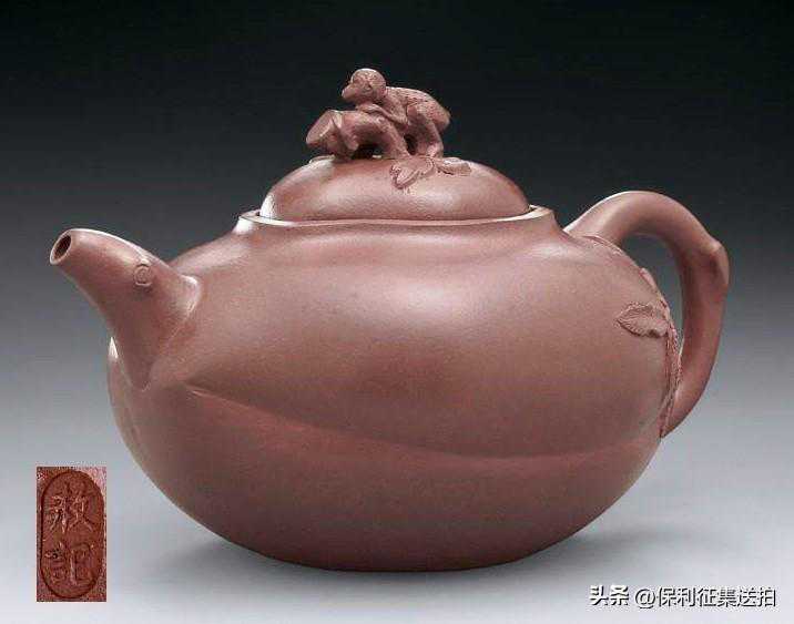 -此壶选泥细腻,砂质有道光时期特征,壶身呈桃形,身筒饱满,以枝蒂作壶流、壶柄、壶钮,并贴桃叶数片,仿生逼真,钮上塑一小猴,寓意“封侯祝寿”,祥瑞吉庆。