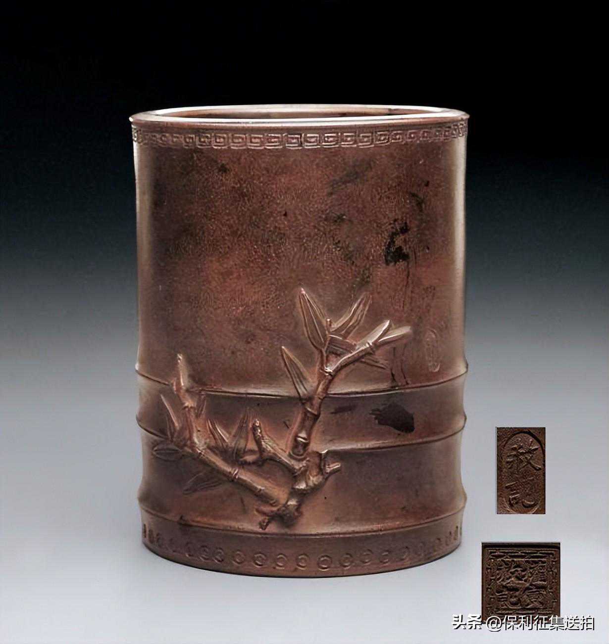 -此件笔筒以竹段为筒身,取四节竹段,呈节节高升的形态。筒口沿饰一圈回纹,底部一圈管钻小圆圈,一面贴饰竹枝及竹叶,古朴秀雅。整器包浆古旧自然,乃紫砂文房佳器,颇为罕见。