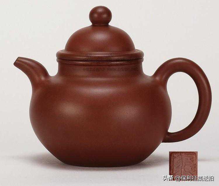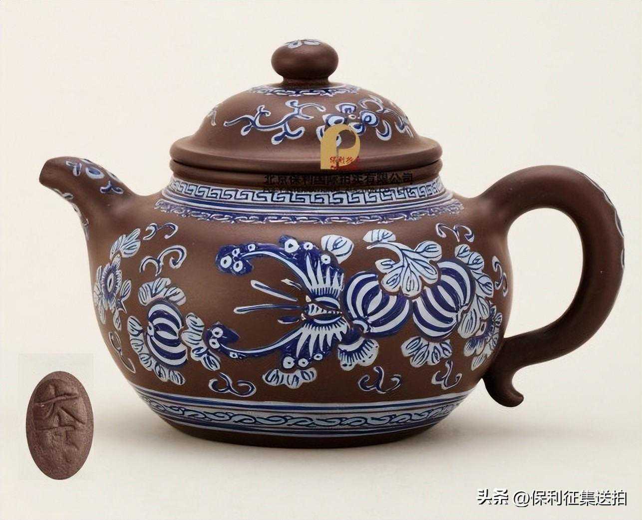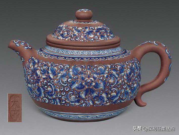 -此壶为清中期制壶泰斗邵大亨所制。泥色呈紫褐,砂质纯正,型制饱满,气韵温雅,珠圆玉润。该壶属於古莲子壶式,或俗称掇球壶。壶体圆腹略高,一弯流曲弧,执把圆弧有力,功法严谨。一亮点是加彩装饰,一侧蝴蝶彩瓜,一侧莲子花卉。紫砂茗壶的釉彩装饰历来倍受清宫廷珍爱,此壶面施蓝釉花卉图案,技法高超,属上乘之作,应为清皇室匠师所为的宫廷紫砂器。