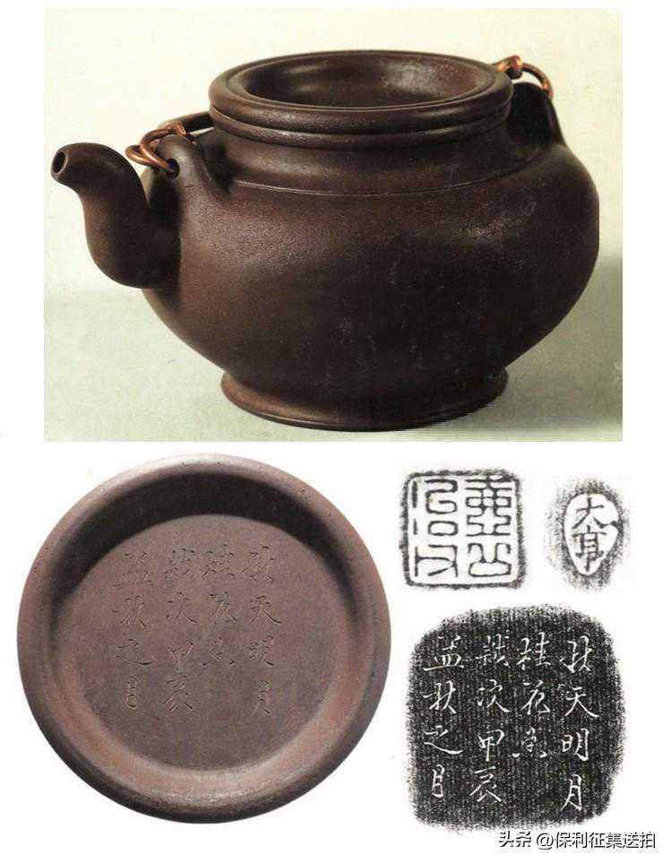-此壶泥质细腻,泥色纯正,造型朴素精雅。外加提梁,为嘉、道以来瓷壶所习见,此当为砂壶仿制之新型壶式。壶嘴捏制精确,出水流畅,不留涓滴。考大亨其人生年卒月,资料不载,传世作品亦极少制作年款,独此壶壶底刻有“秋天明月桂花香,岁次甲辰孟秘之月”,殊属难得。甲辰为清道光二十四年,公元1844年。壶盖外钤阳文楷书“大亨”瓜子形印。