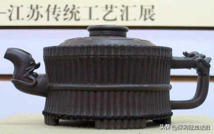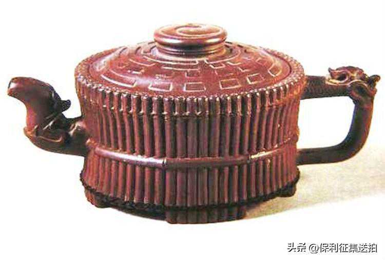 壶身外壁似一捆整齐的竹段,中腰以一竹束之。竹段顶端(即壶面边沿)逐个雕刻小圆圈,以示竹心中空,形象逼真。壶盖以的为中心雕八卦纹,把、流堆雕龙头。壶底三足,亦雕刻矮竹段编连状,底面雕星象纹。壶色泽蟹青,造型典雅,装饰协调,堪称上品。
