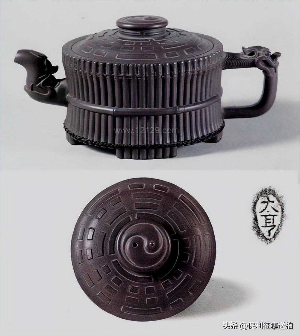 砂质深紫,壶式取法大亨八卦龙头束竹壶,唯改去壶流与壶把的龙首造型,改以竹节代之,并作六方形,视觉上更浑然一体。此壶盖上饰以印花的伏羲八卦方位图,盖钮以太极居中,壶身用60根细竹束成,加上壶流、壶把、壶钮及壶身束带共64根竹子,象征《易经》中的64卦。每根段竹大致均匀,制作虽然看似随意,然而率性中工整严谨。六只扁足分别由腹中延伸出,每五根成组,壶底仿造古代易学文献压制成河图与洛书,制作颇费心力。