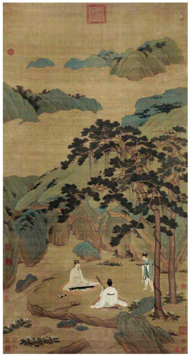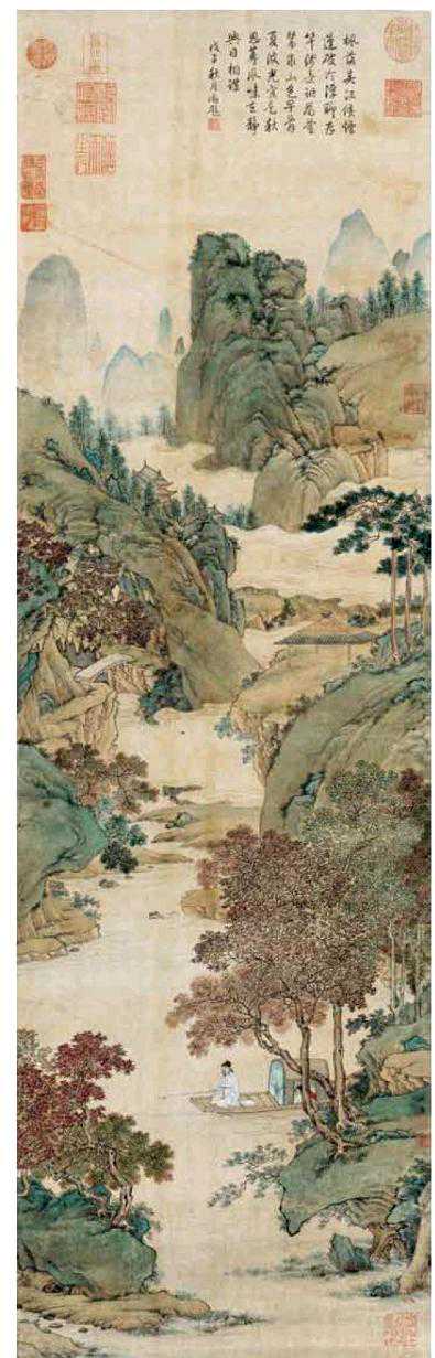 仇英的画风多样,技法全面,而最显其品格的当是他的青绿山水。仇英在青绿绘画上有独特造诣,被视为北宗代表人物赵伯驹之后身。这也是他在画史上占有一代大家的地位的原因。