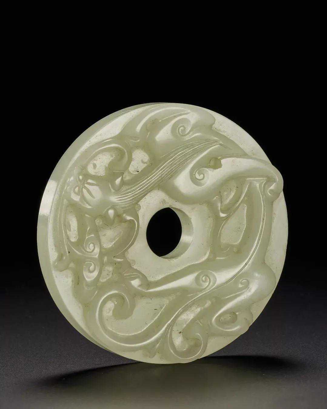 此玉璧圆形,以上好青白玉雕琢,玉质细腻。玉璧两面均事雕琢,一面为两条高浮雕游螭,形态生动,颇有灵气,另面为浅浮雕勾云纹,布局疏朗。龙生九子,螭为么,无角,好险勇猛。