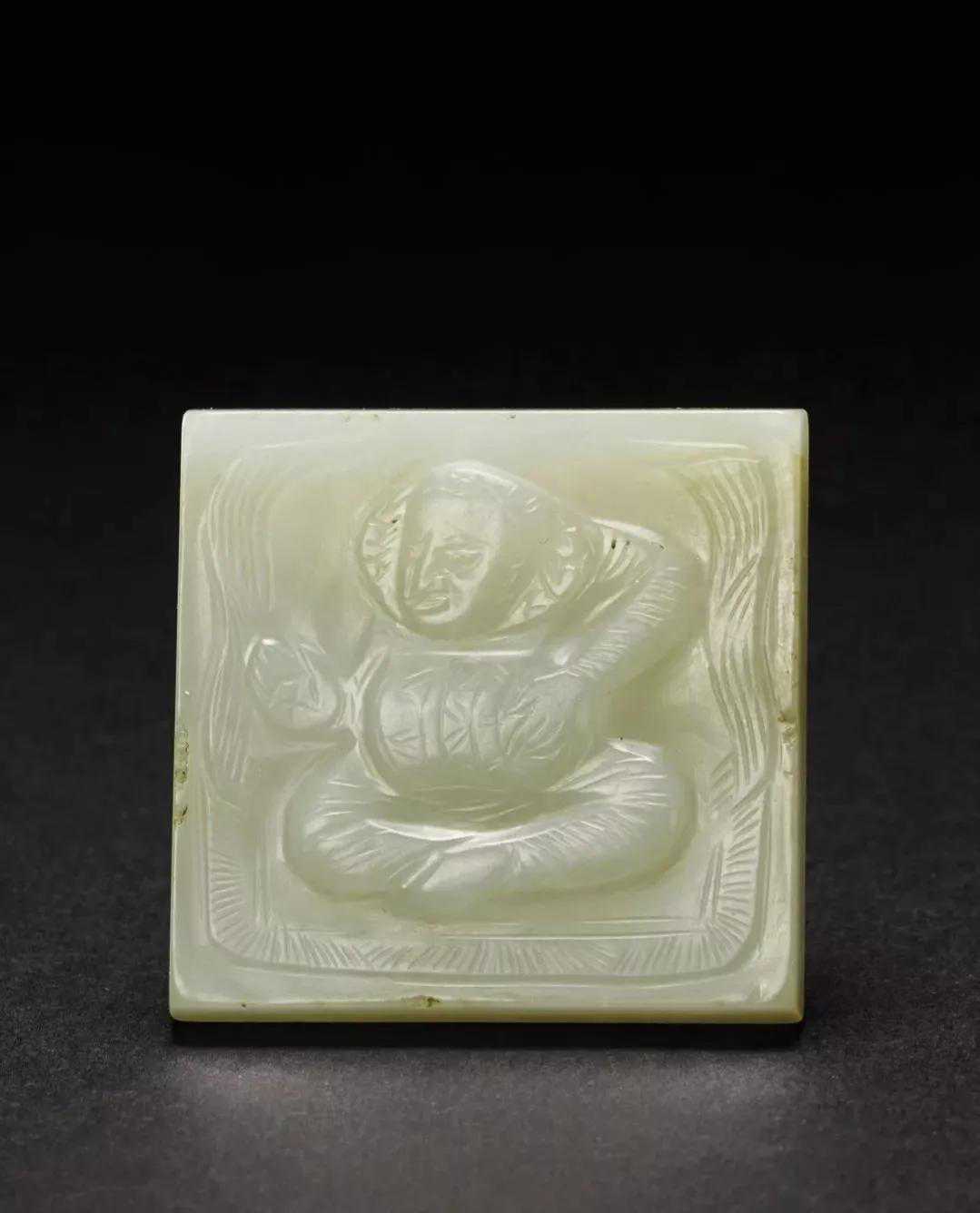 此玉板扁平方正,正面浮雕胡人伎乐像,背面光素。形制、纹饰、雕刻手法具有明显的时代特征。整器四边微微凸起,中间浮雕人物,胡人盘腿而坐,双手击鼓。刻工以大面积的阴刻线来表现人物的衣饰、乐器等。此玉板充分展现东西方文化互相吸收融合,大放异彩。