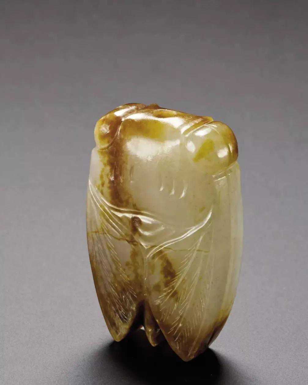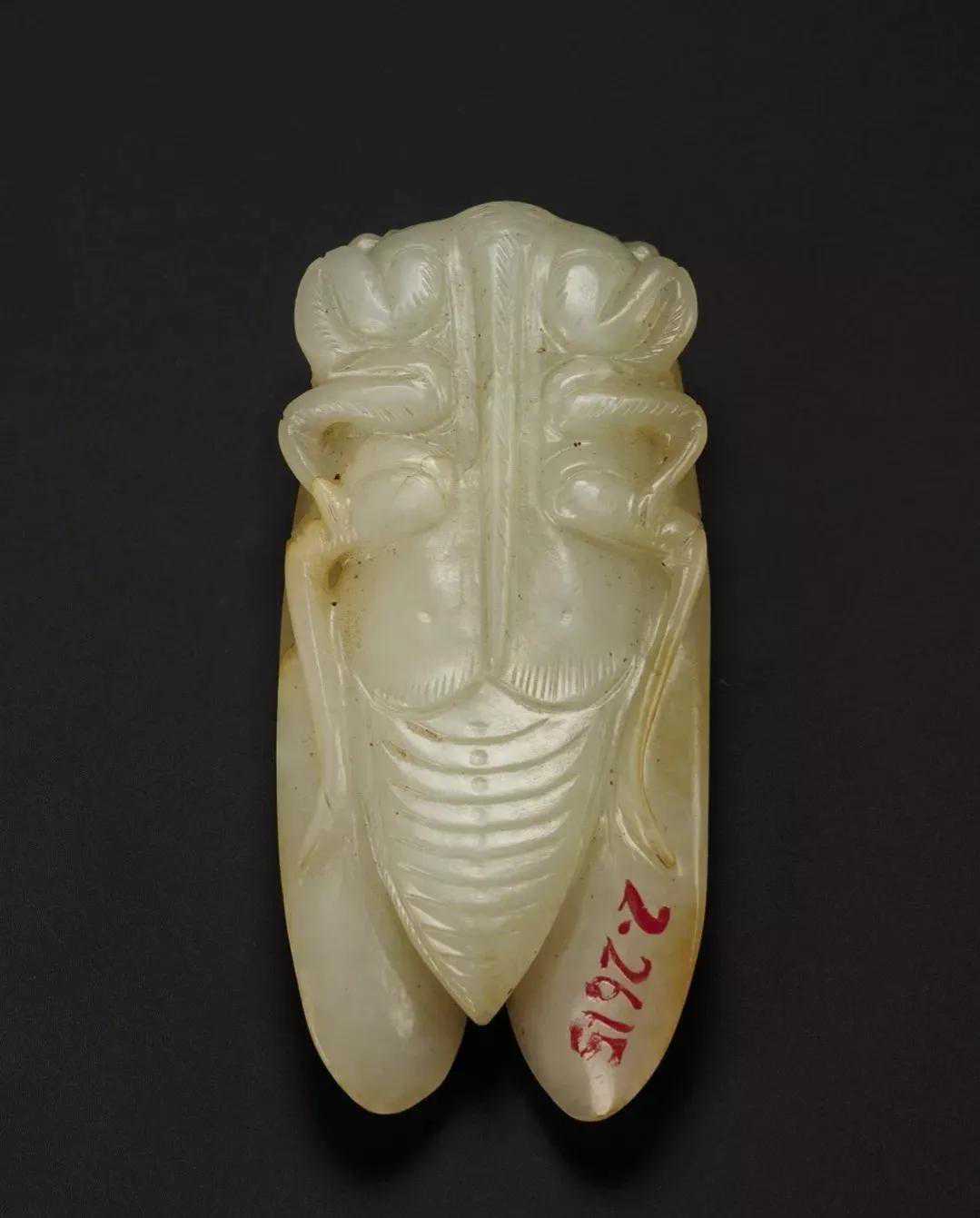 台湾藏家旧藏玉蝉为白玉质地,有红沁。头部端正平齐,近尾作弧尖形,背脊线隆起,两侧渐薄,用减地法雕琢出蝉的双目与两翼。翅膀有脉纹,立体感强。