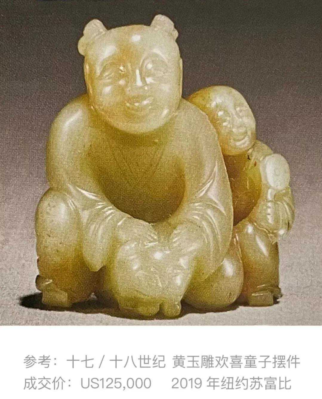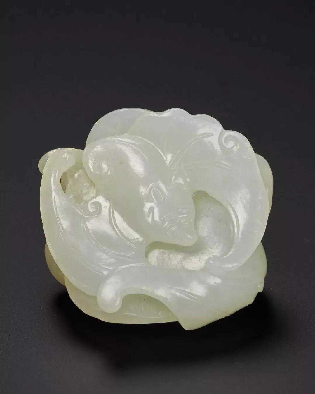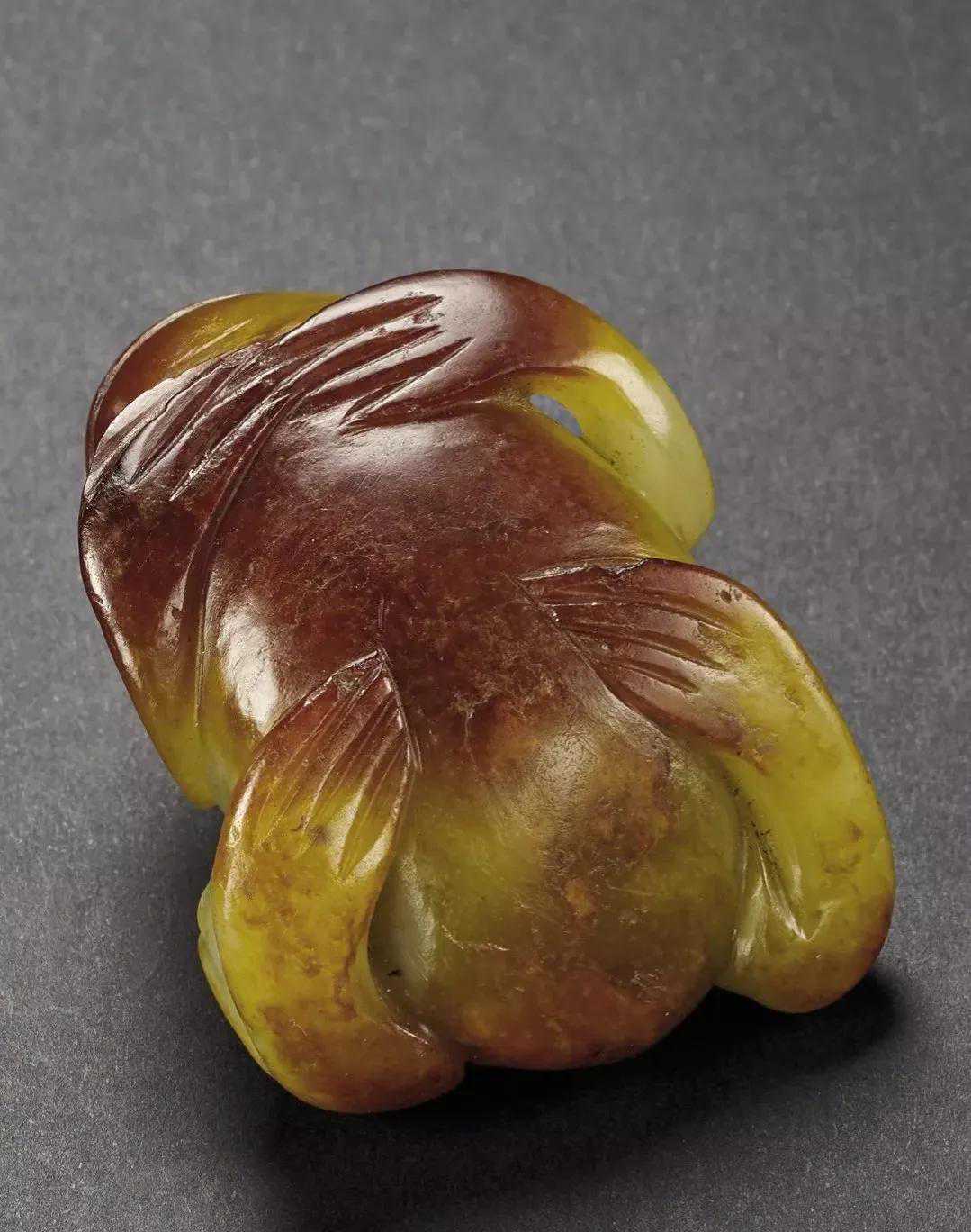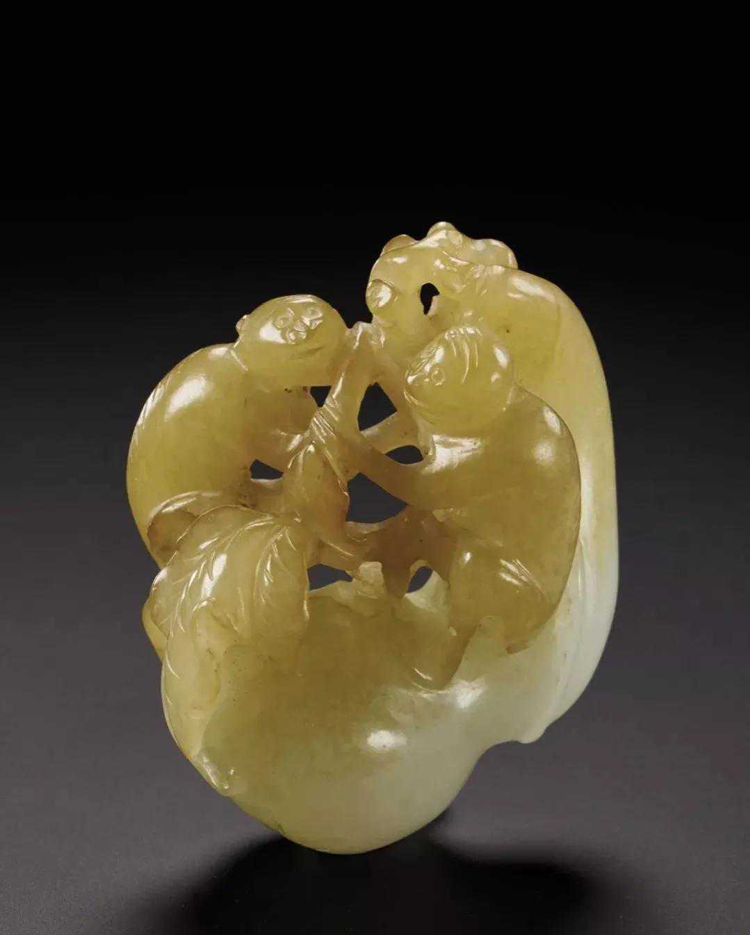 此器玉质莹润,局部带黄沁,为清中期典型苏州工艺雕刻。整体圆雕,底部为一布口袋造型,口袋上有两只灵猴,弓身而立,圆润生动,灵敏迅捷。布袋玉猴子的组合题材,取谐音寄托代代封侯的美好寓意。
