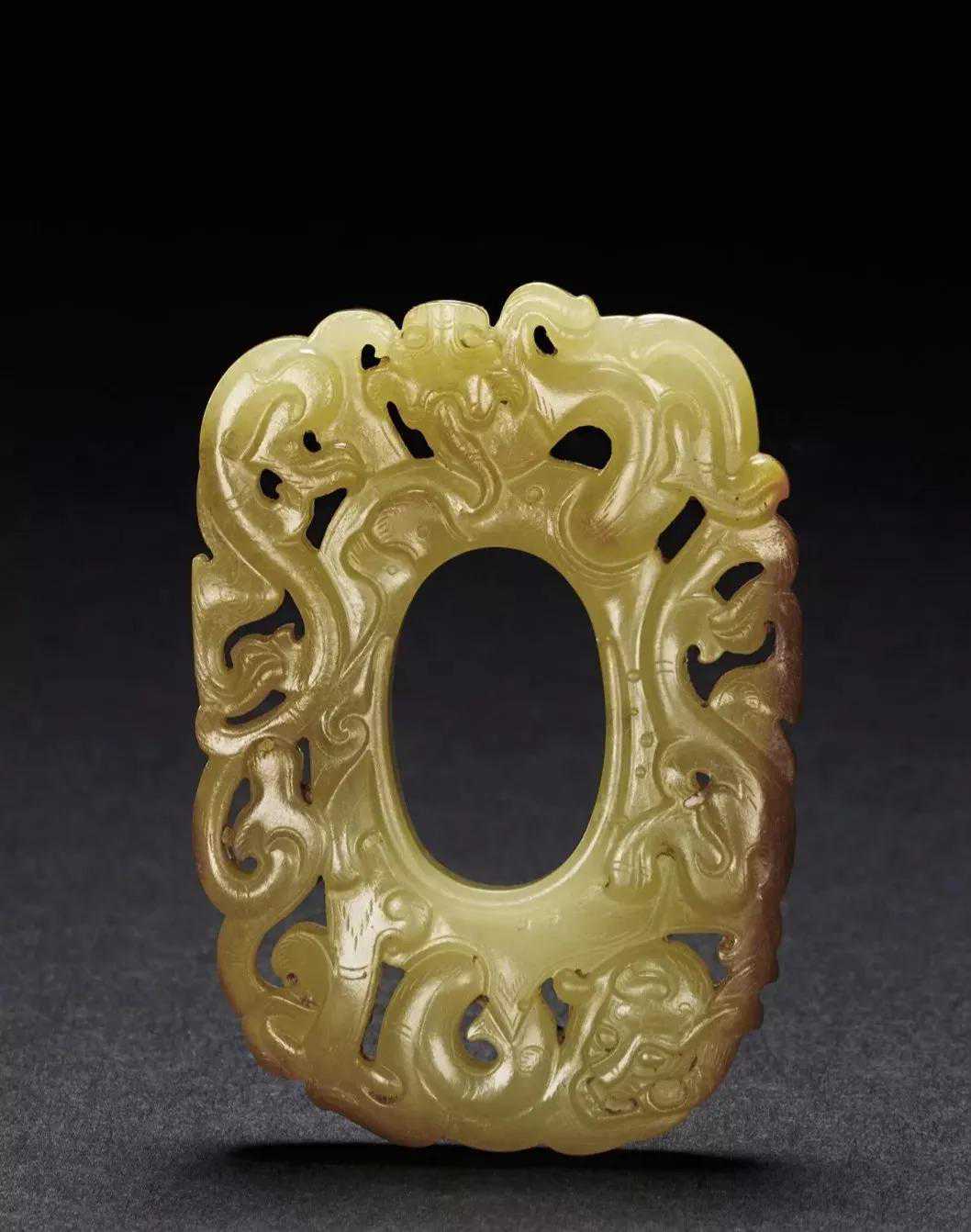 玉佩白玉质,色泽温润,局部受沁。扁平椭圆形,中心透雕对称兽面纹及两对鸟兽纹,体盘转曲折,其上阴刻卷云纹装饰。外缘满饰谷纹。玉佩造型古朴,雕刻精细,纹饰于对称中现出动感,极具装饰效果。
