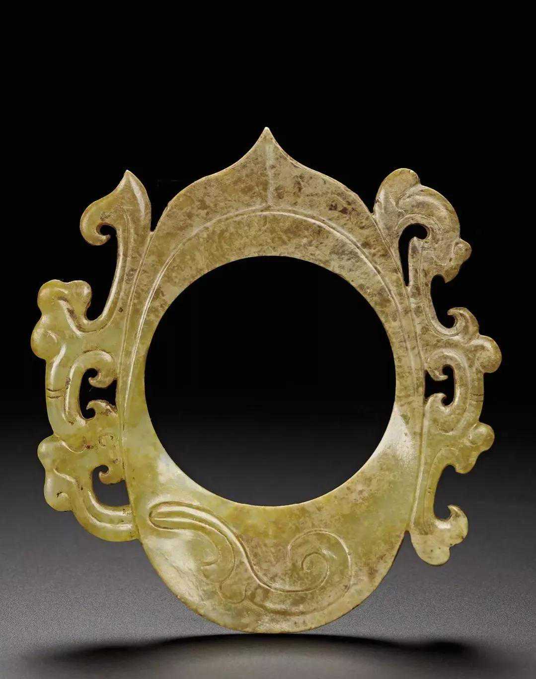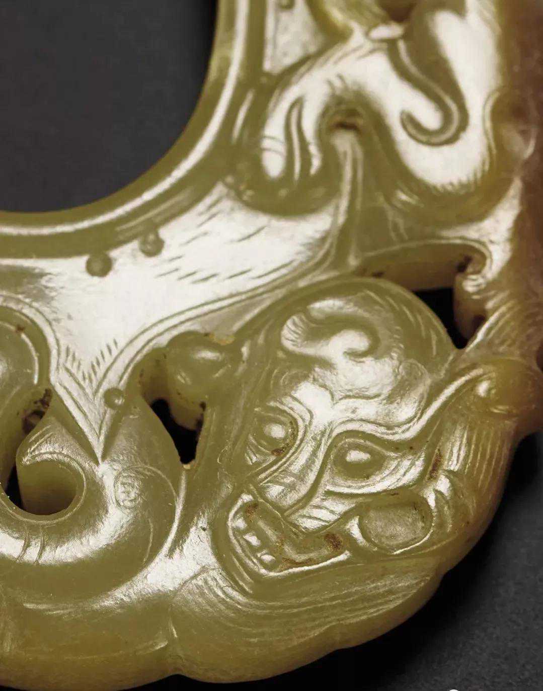 他山雅集旧藏此件玉佩,青黄玉质,圆形扁平状,双面阴刻兽面纹及卷云纹。有之上而下对穿孔,玉质细腻,雕琢规矩,有汉代风格,古雅非常,为佩戴佳品。