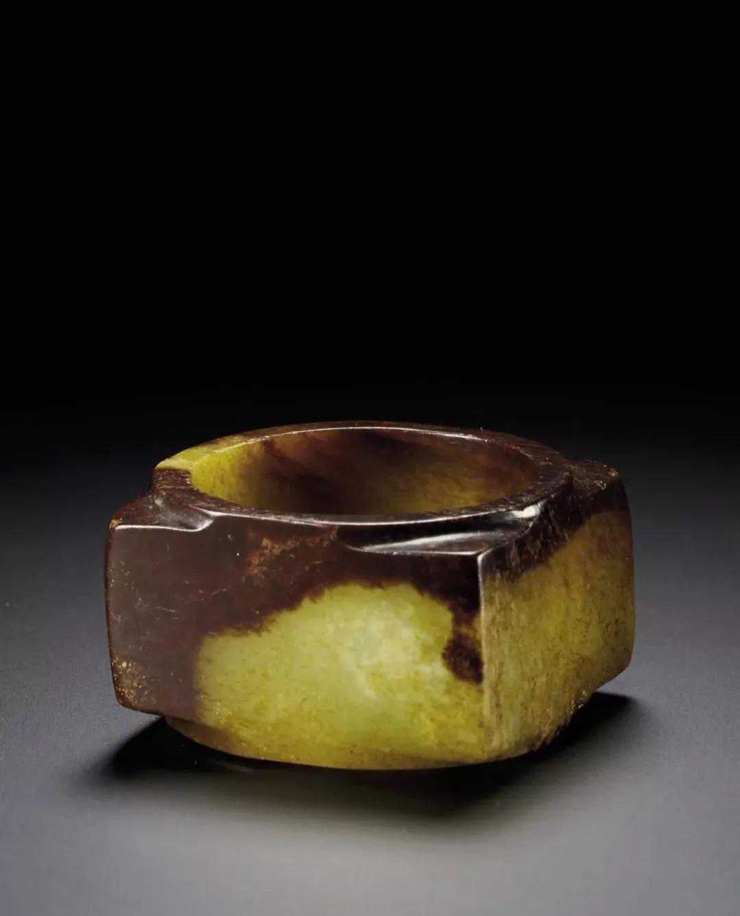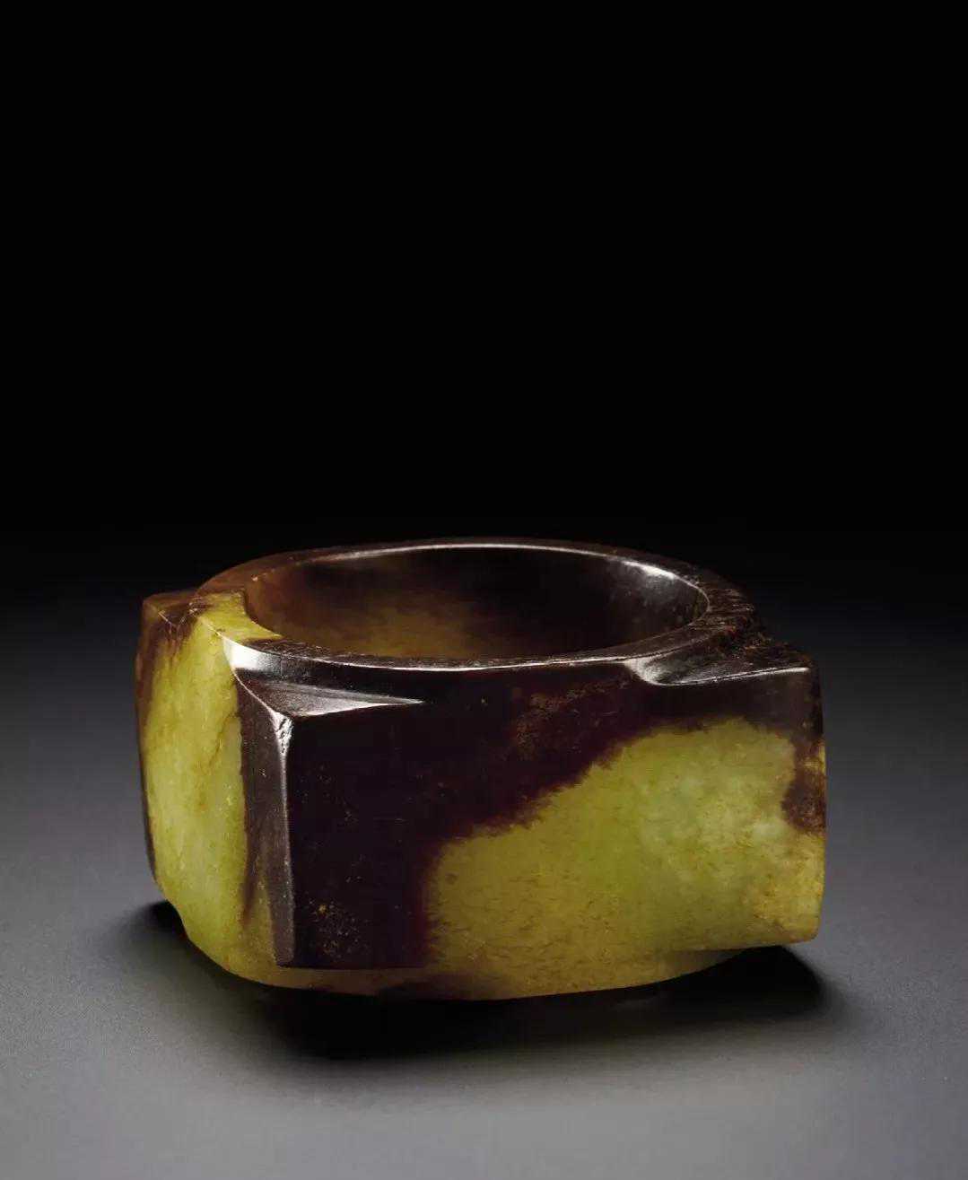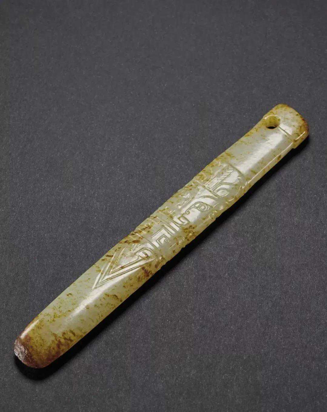 剑秘是剑鞘尾端的玉制品,此件玉剑珑,梯形,周身受沁,一面雕饰饕餮纹,神秘古朴,另面则雕饰勾云纹,底面钻孔用以接鞘。整器古朴雅致,沁色亦优,珍稀异常。