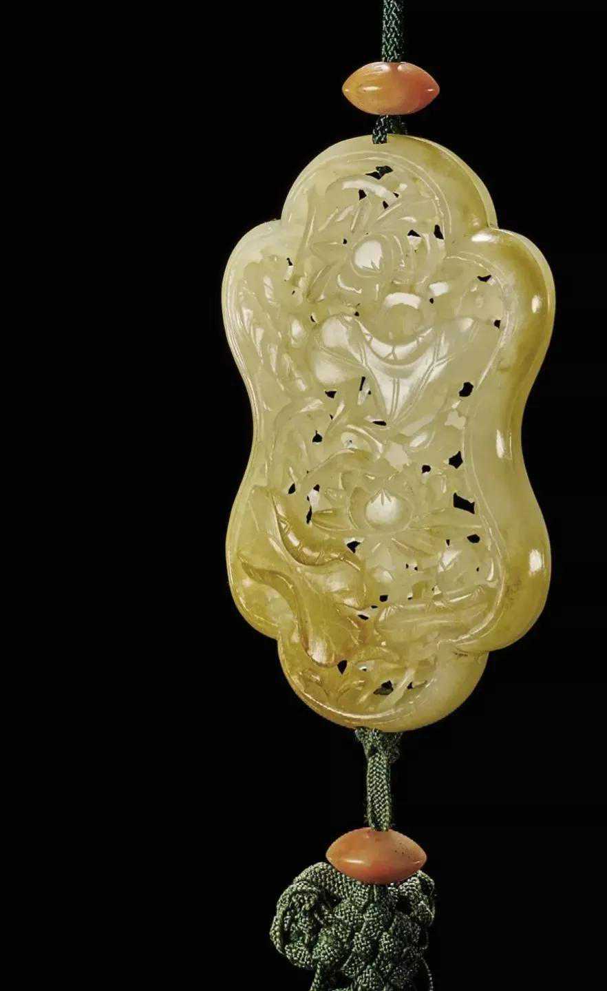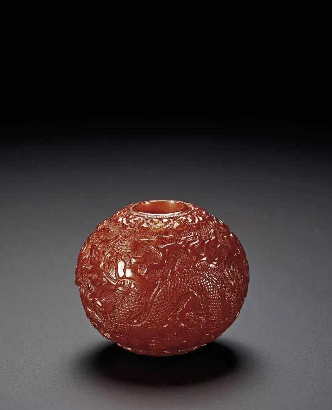 蜜蜡质地,雕作彩蜕坠,呈圆形,周身浮雕云龙纹,其他部位施以锦地,整器雕工精细,纹饰高级,蜜蜡质地红润,色泽纯正,为清代宫廷女性朝服专属配件。彩悦,是清代旗人女性所专用的,一种佩戴在胸前或衣襟上的长条形丝质饰品。满语称之为"miyamiganfungku",直译为"装饰手巾",故而在清宫档案里有时也直接记为"手巾""拴扮手巾"等。在清初的画像之中,旗人妇女不仅在穿着朝服时拴手巾,在日常穿着常服的时候也拴手巾,这显示着彩蜕本身具有明显的生活用途。后来,彩蜕变为了一种单纯的装饰品,并且在乾隆朝正式进入了《大清会典》成为了官方规定的女朝服装饰之一。彩悦上端一般拴金属环或玉环作为连接,并垂下数条小挂坠,均系上各类宝石坠角。此蜜蜡圆珠即为彩蜕坠角,其选材、做工均堪上乘,可见级别之高。