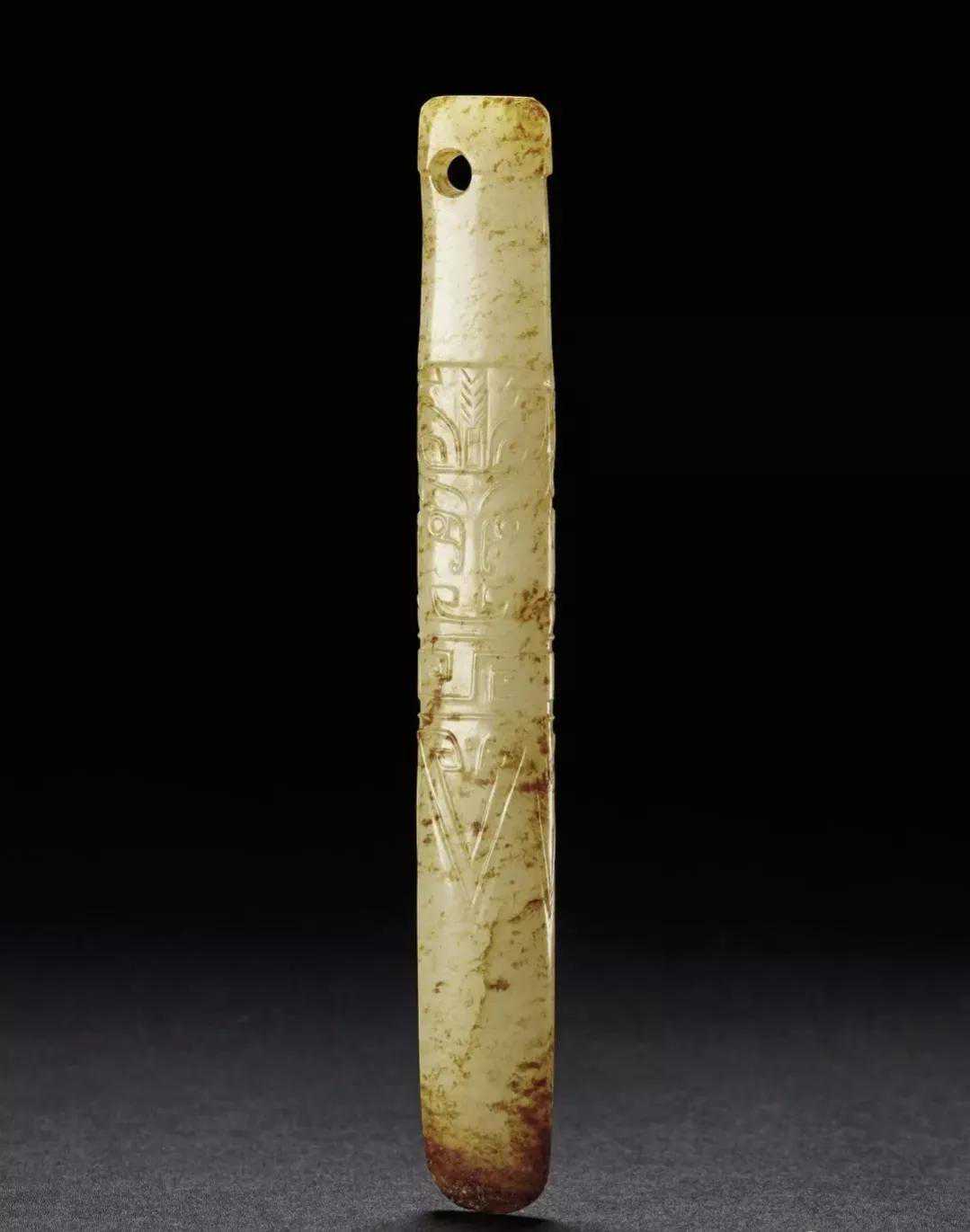 本件柄形器,白玉质,满身红沁。细腻润透,光泽柔和,经过长期盘玩已呈现脱胎包浆厚重。器物为扁平长条形,形制经典,造型、线条优美流畅。顶端穿孔,柄身中央正反面均阴刻兽面纹,雕琢饱满细腻。此件柄形器玉质精良,做工考究,疑为早期古玉,后传至清代宫廷,后添博古纹饰,等级较高,为同类器物中的佳品,适宜收藏。