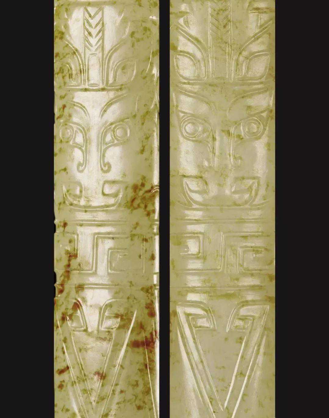 剑秘白玉质,四周红沁包裹,呈色沉着古雅。器呈梯形,中间隆起,两边呈斜坡状,穿通天孔。雕饰兽面纹,除双眼及鼻可识,余皆以繁密勾云纹为饰,线条精准规矩,方折勾连,线条自然流畅。制作精细,抛光细致,沁色古朴内敛,富有层次感。