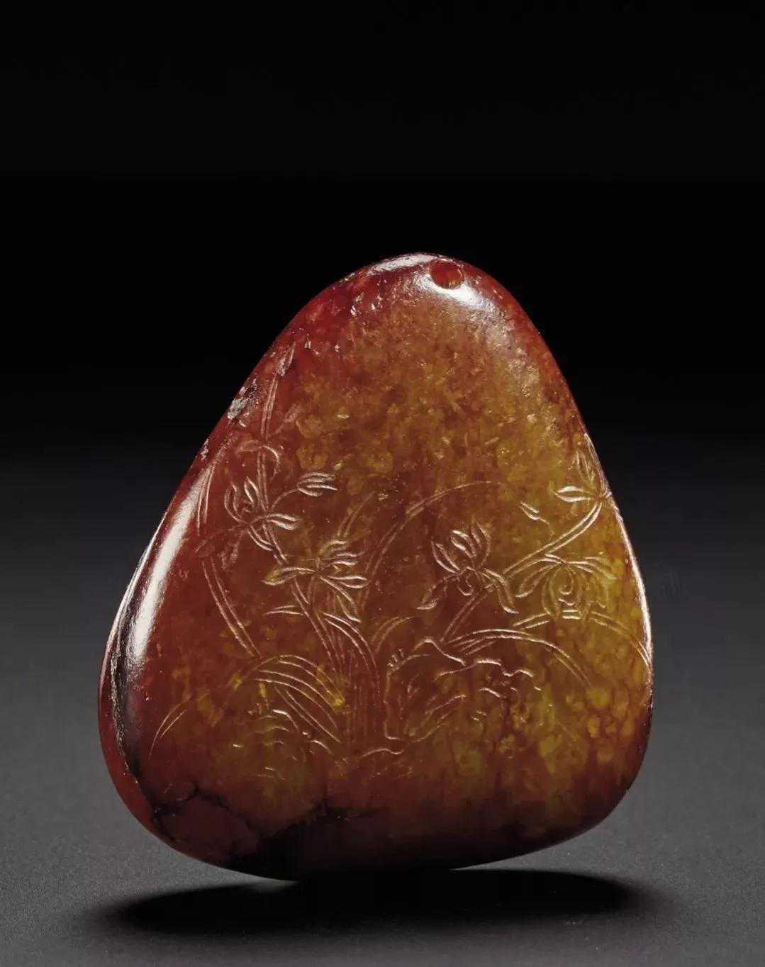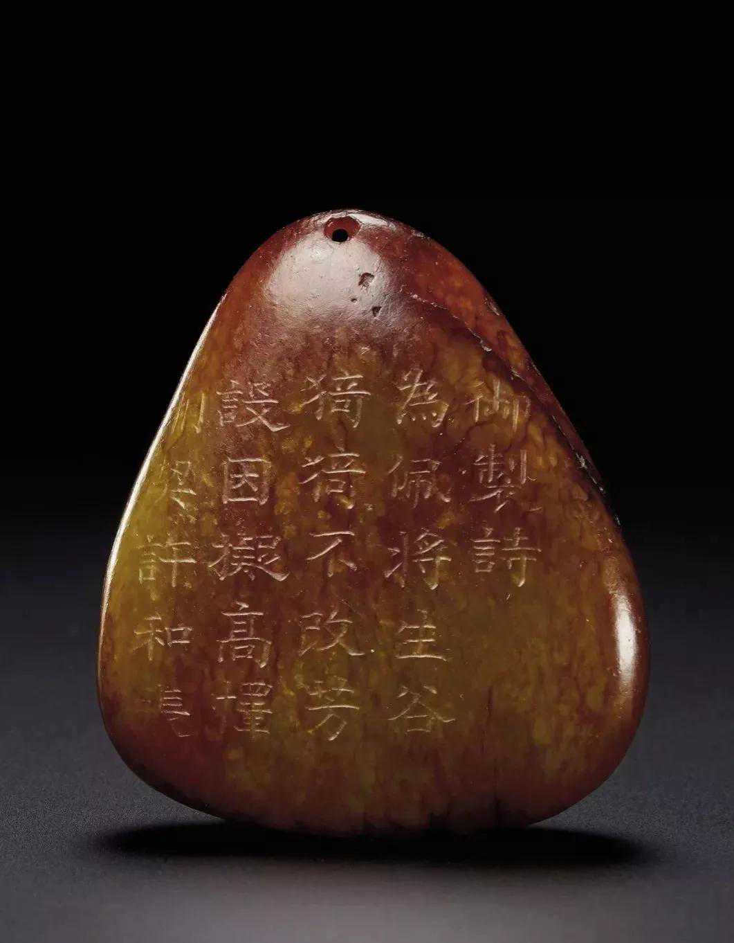 设因拟高怪,相契许和张。此件御题诗坠,白玉质地,取材精良,红皮色泽温润柔美,上端有孔,便于穿绳佩戴。表面阴刻兰草图,颇富生趣,另并配"御制诗",诗书画三者合一。此坠兰草诗文雕刻线条简练流畅,细微之处更见生动典雅,当为清代宫廷珍品。