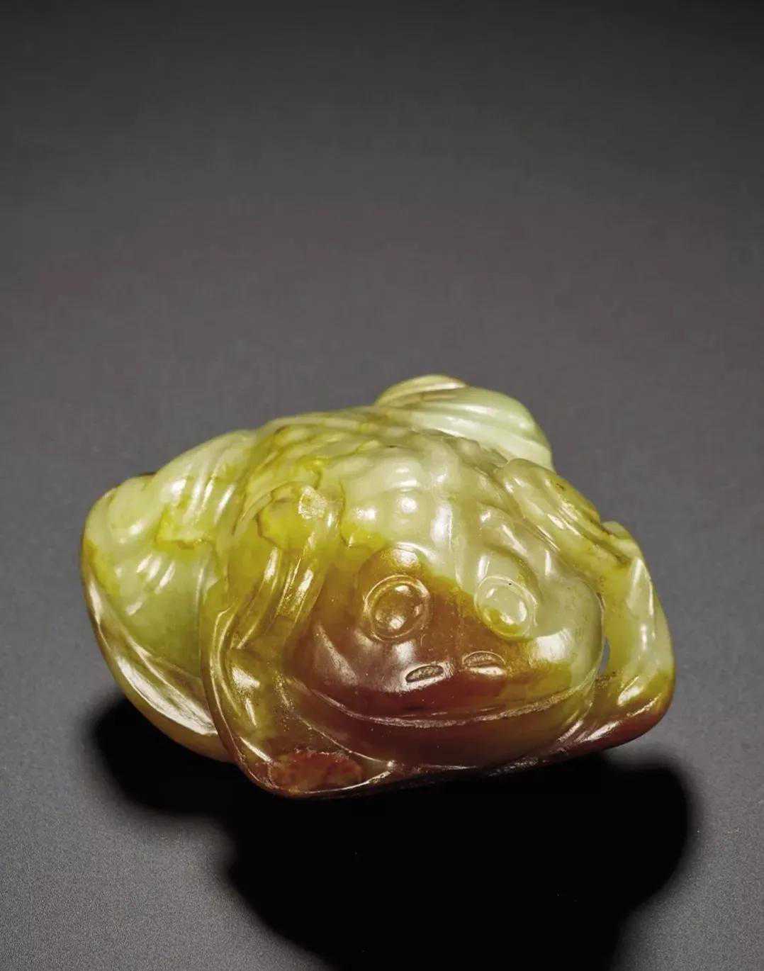 蟾蜍以黄玉雕成,蜍蹲伏于地,体型健硕,腿足饱满有力,似欲跃然而起,双目圆突,下颌外鼓,背上浮雕点点癫疣,状如真物,嘘翕欲动。质感强烈,颇得写生要旨。造型洗练写实,气韵自成,玉材厚实,磨工细腻,为玉雕佳作。