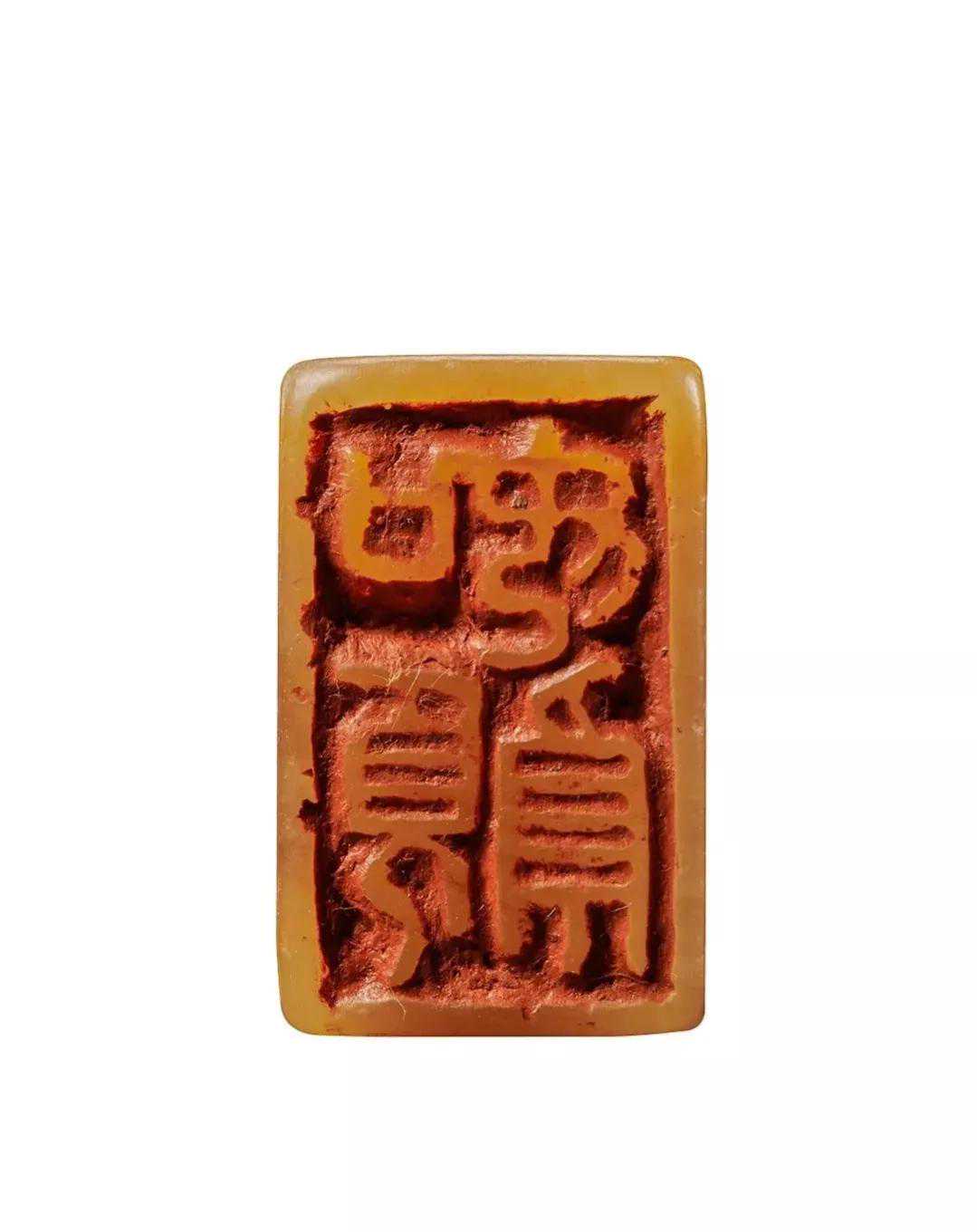 印文:重间白玉质,质地致密润泽,受红沁。雕作覆斗印,形制正方,裁切规整,印钮有对穿孔。印面阴刻"重间"。覆斗印为早期玉印的经典形制。覆斗钮,顾名思义就是将印章的鼻作成覆斗形。和瓦钮一样,覆斗钮也是最早出现的几种印玺钮式之一。现有早期期印章的钮式绝大多数是覆斗钮,尤其是姓名印,经常使用这种钮式。