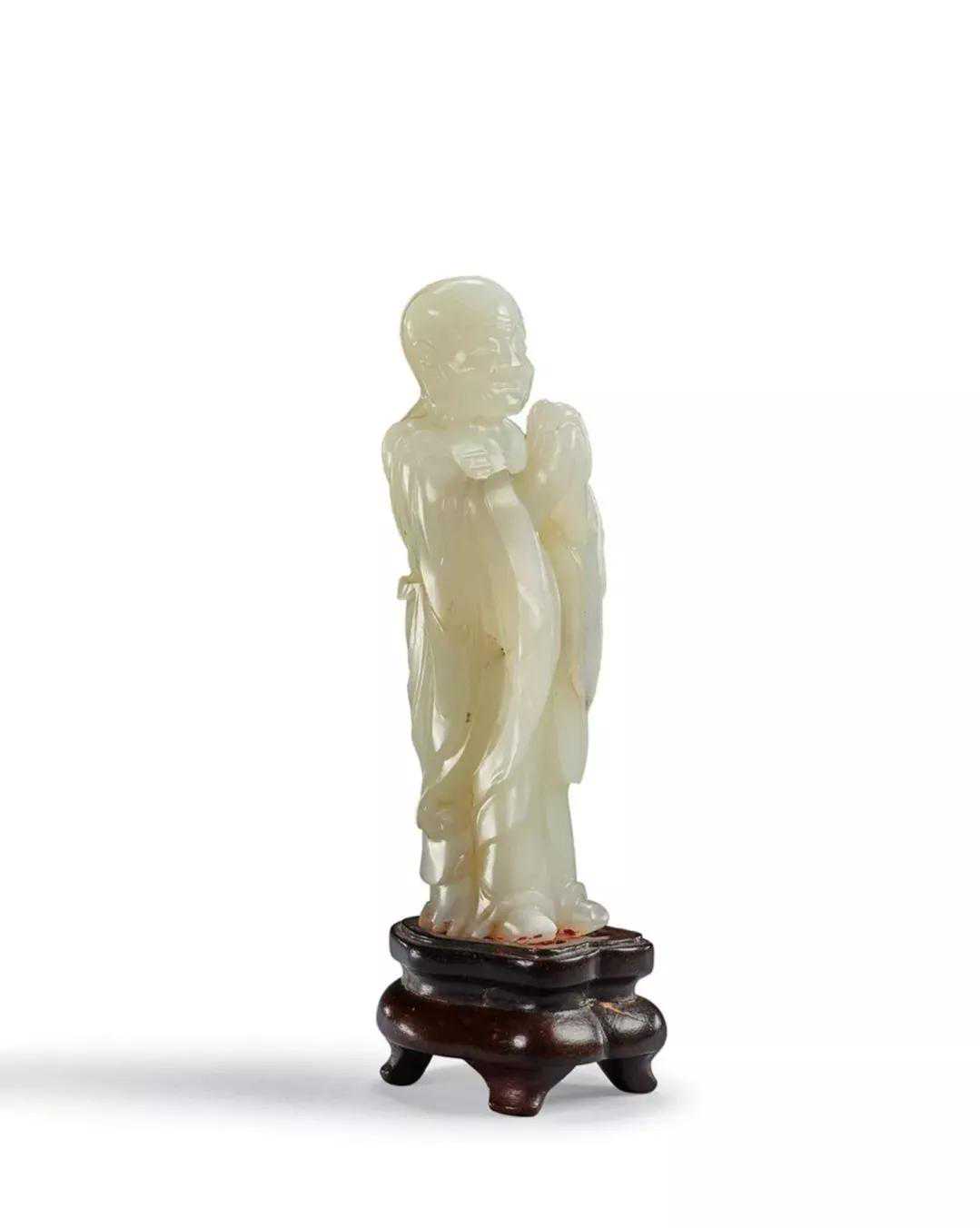 白玉质迦叶弟子像,身材修长,长宽衣,神态自若,双手合十。五官琢磨精致,刻画准确传神,衣纹灵动,质感强烈。迦叶是释迦牟尼"十大弟子"之一,号称"头陀第一",是弟子中的长者,深受释迦器重,我国禅宗将其奉为"西天第一祖师"。