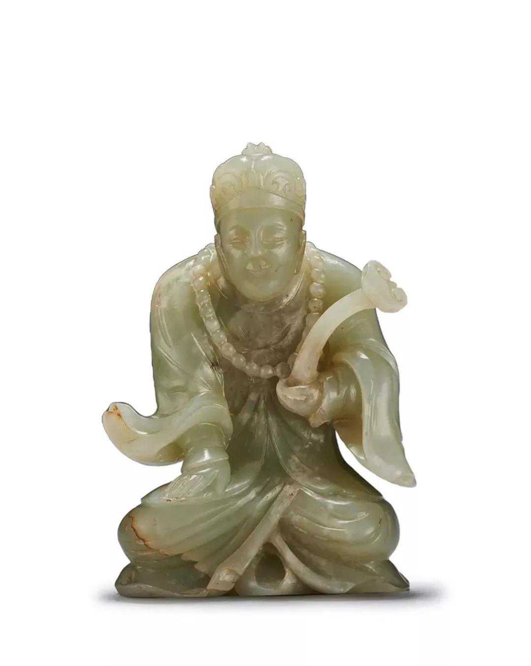 此器白玉质地,制作精良,头戴冠帽,胸前挂一珠子,手持如意,呈蹲坐之态,衣袂飞扬,表情祥和自在,颇有道家怡然灵动之气息。灵宝天尊,又称为"灵宝君"、"上清大帝"、"太上大道君"等,是道教最高尊神"三清"之一。灵宝天尊原为"二晨精气"、"九庆紫烟",后来托胎洪氏,怀三千七百年,诞生于西那天郁察山浮罗之岳,位登高仙,治玄都玉京。在三清殿中,位居元始天尊左位,手持太极图或玉如意,象征混沌始辨,阴阳初分的"太极"状态,其圣诞为阴生阳消、昼长夜短的夏至日。