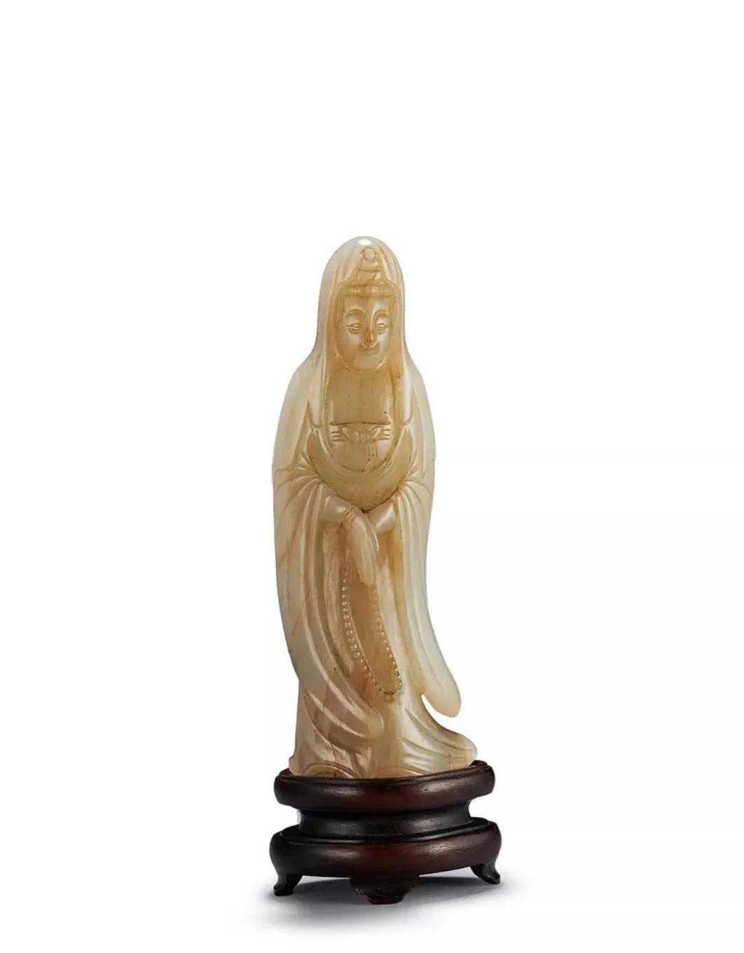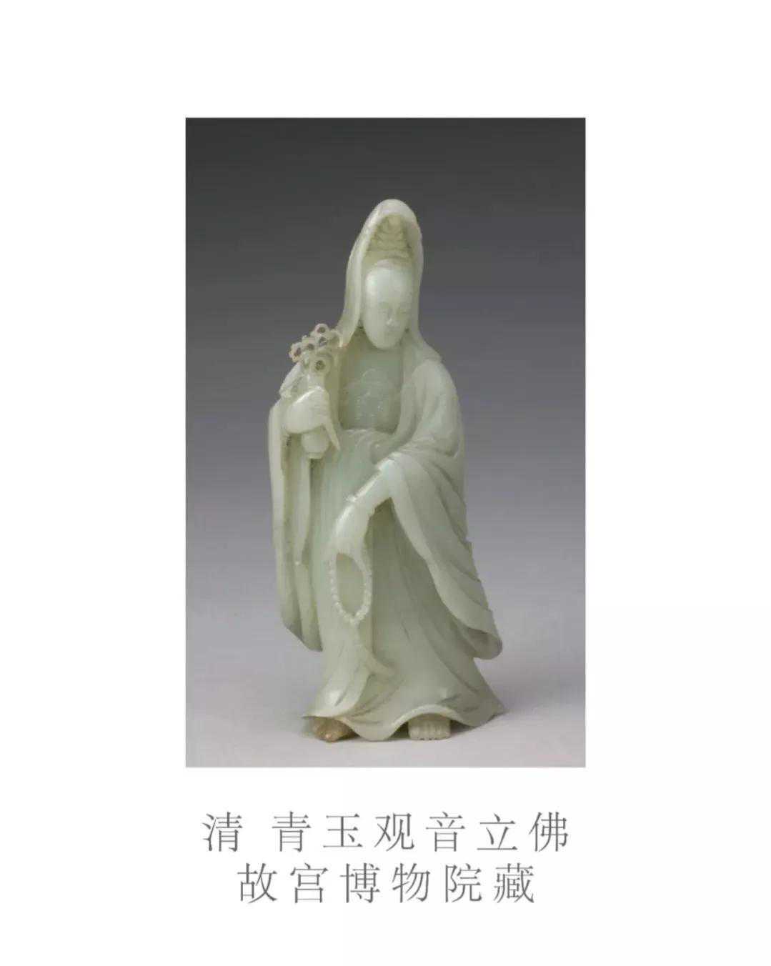 白玉质地,圆雕。观音呈站姿,高束发髻,头戴风貌垂于肩背,细眉,目视前方,面形长圆,神情静穆慈祥。上着长袍,大开领;下系长裙,手持念珠,右手轻轻搭于腕上。观音风帽、袖口、裙尾处皆以阴线刻划。衣纹雕琢精致,垂拂流转富有动感。