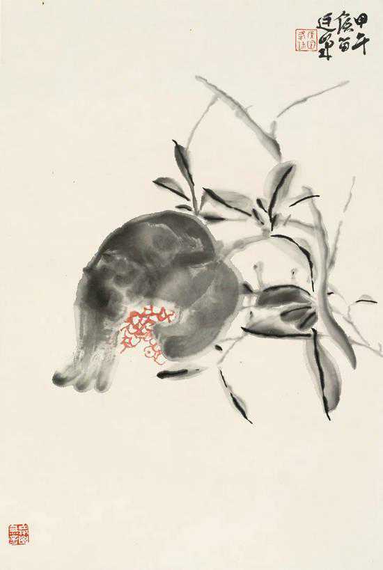 侯廷峰的艺术个性在他的大写意花鸟画中表现得很鲜明,那扑面而来的是视野广阔、气象恢弘、豪情万丈的气势。这种气势,正是他自身个性的反映。侯廷峰,这个土生土长的北方人,父亲早逝,家境清贫,由此锻炼了他不屈不挠、自强不息的性格。他自幼爱好绘画,培养了他苦中作乐的情怀。在他的大写意花鸟画中,最能打动观者的就是这种品格和气质。画面布局慷慨纵横、气势恢弘,笔墨汪洋恣意、不拘格式,造型夸张、生猛。没有经历过生活磨砺的人,是难以表达出这种既带着对泥土芬芳的赞美,又含有对生活苦难的体验情感的。在《石榴》这幅作品中,这种沉默的张力尤为明显。石榴的造型以方代圆,外壳用笔粗放、拙实,裂开的口子生硬、强烈,里面一颗颗石榴籽犬牙交错地摞叠在一起,方笔勾勒,没有一丝水灵的鲜嫩感,只让人感觉到西北荒凉干涸的土地上,没有丝毫修饰的生命本能的残酷爆发。