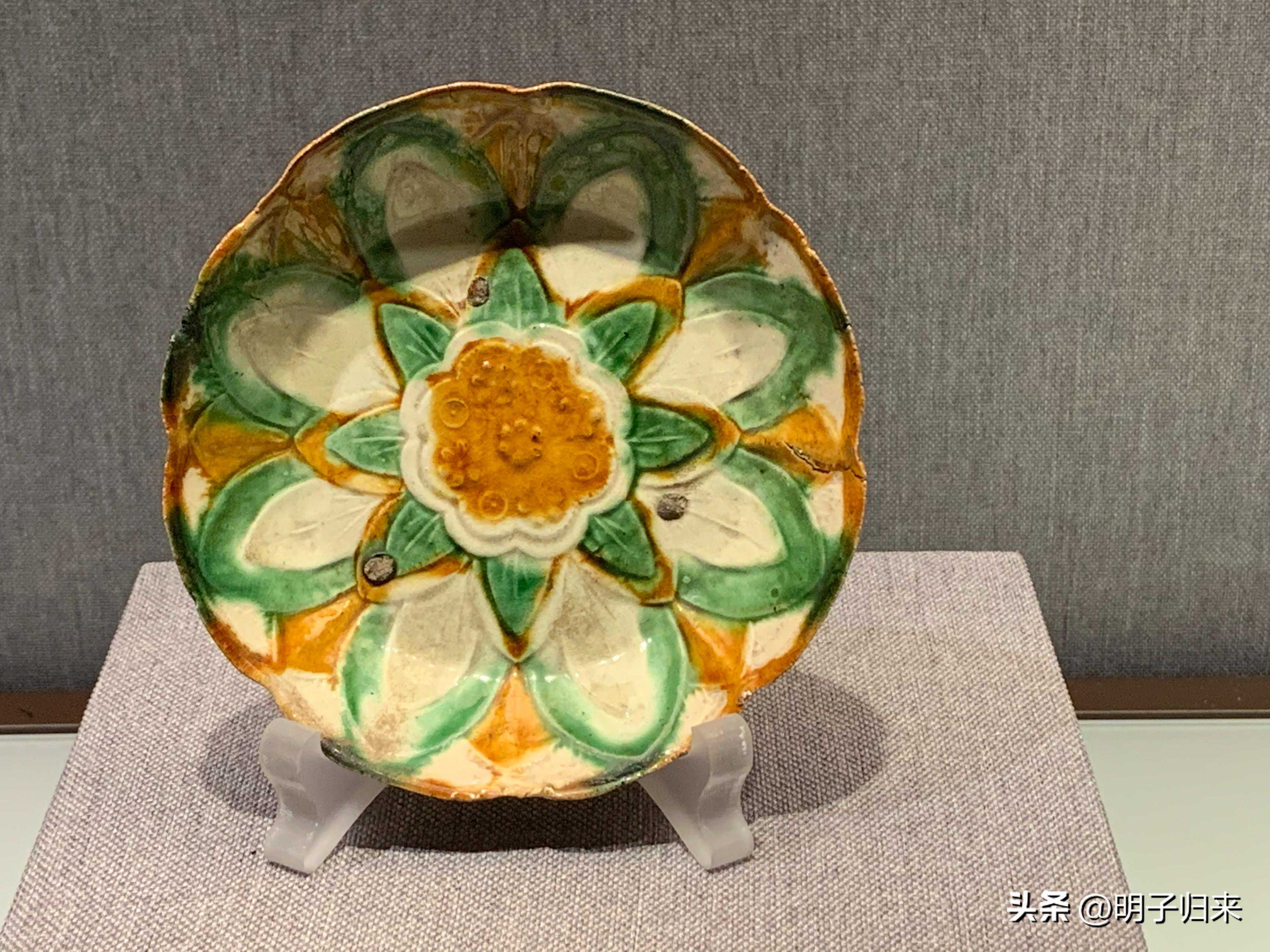 辽三彩釉印水波三花纹海棠盘(契丹陶瓷代表器型)