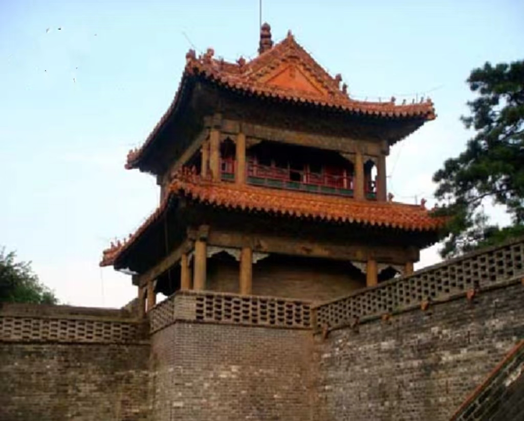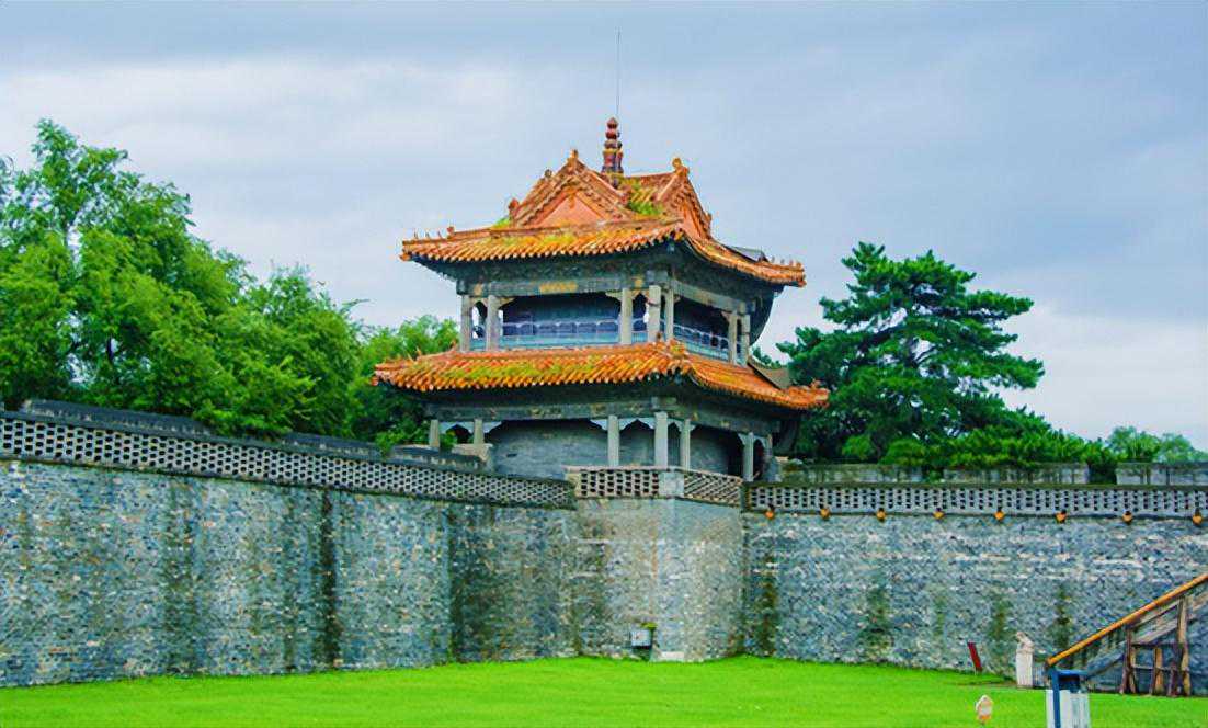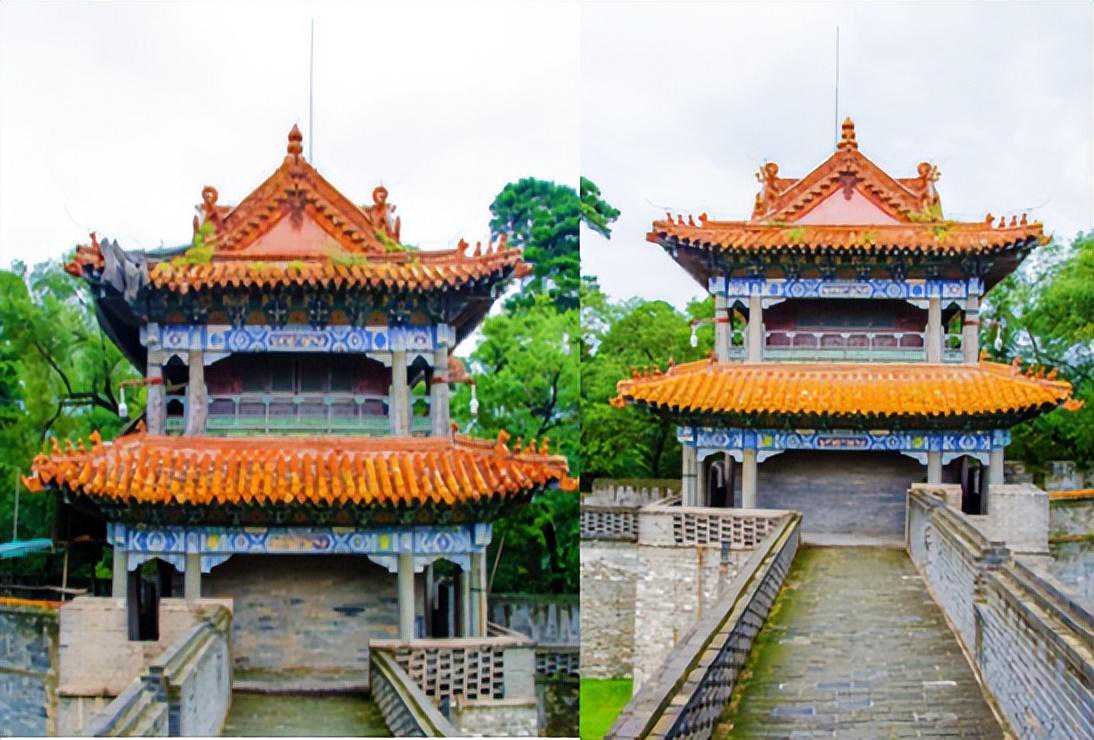 方城四角各有一座二层重檐歇山式角楼。方城与外围的风水墙形成了内城外的格局,城堡全部采用砖石砌筑而成,将隆恩殿竺主体建筑围在中央,起到了防御作用。
