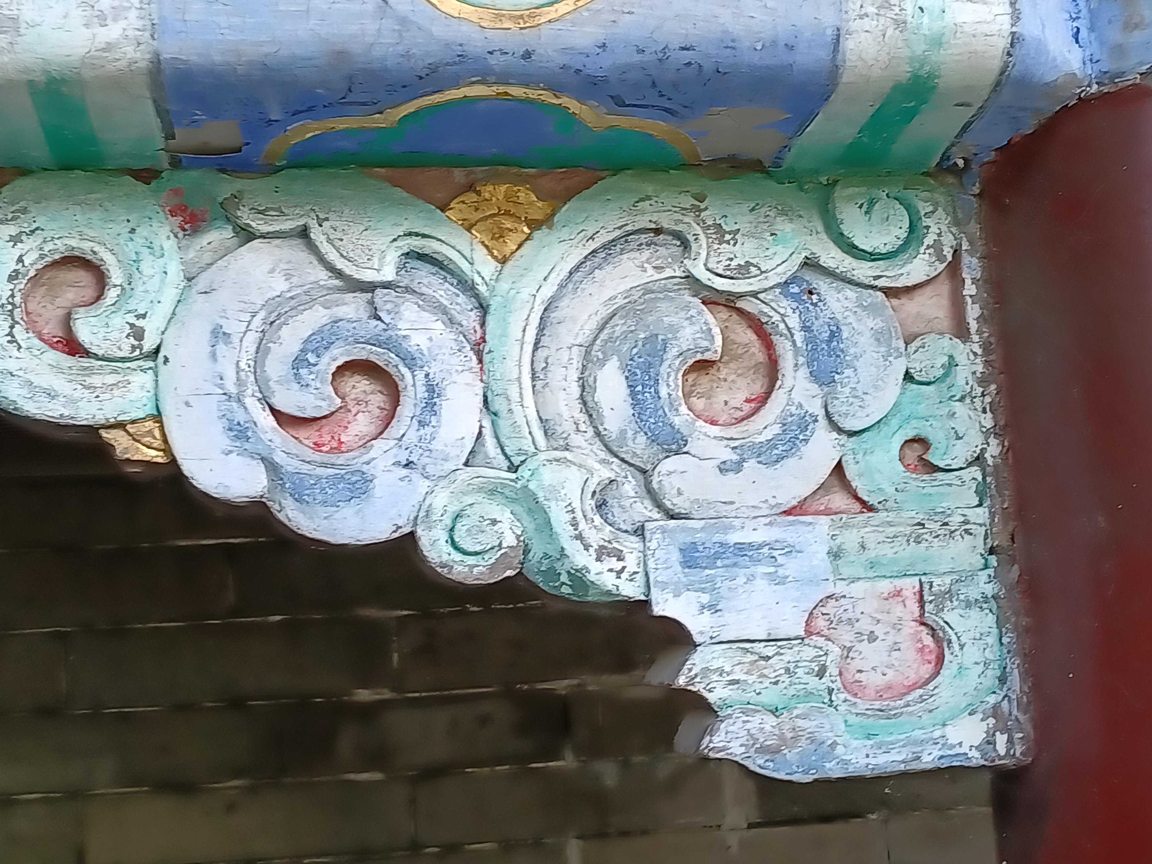 角楼内檐也保留了珍贵的三室珠吉祥草彩画。朱红基地上,青绿相间设色,拉小线,黑色勾勒,两端有箍头。构件三看面均为直线型构图。