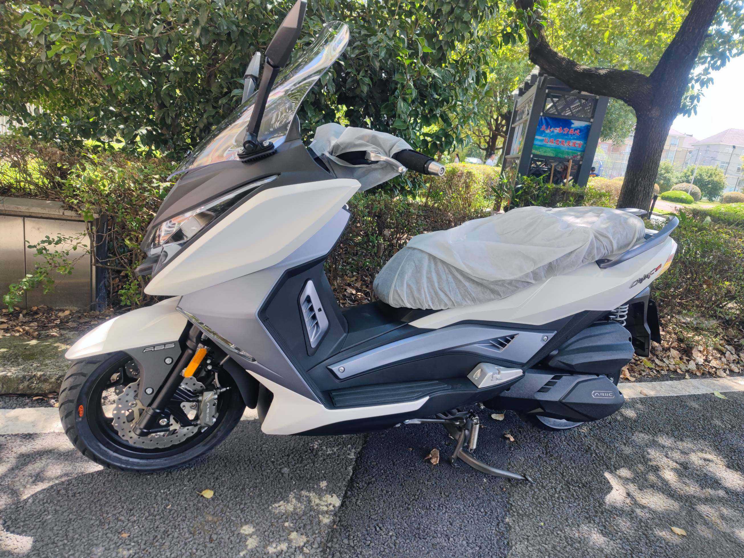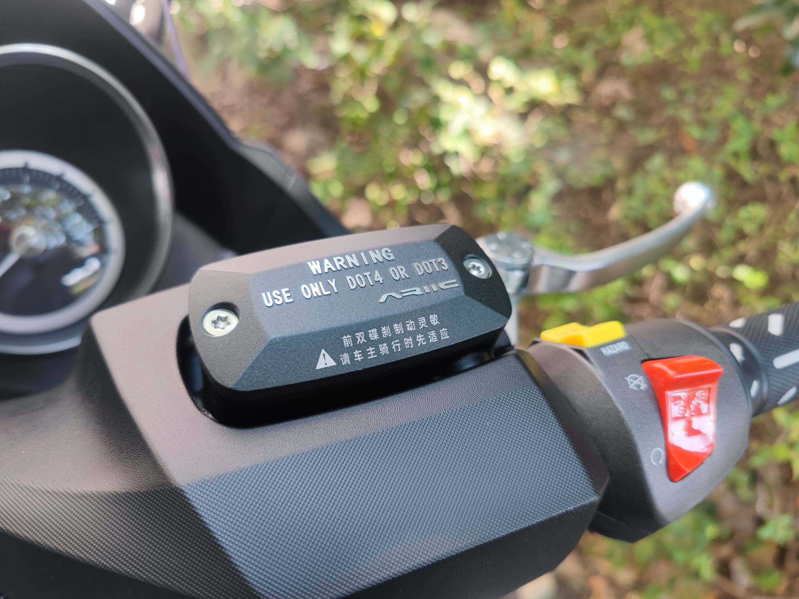 接下来看看刹车以及其他部分的做工。首先说说这个双碟浮动前刹,在这一级别或者这一级别的其他车型中,这样的配置对于一台踏板来说的确有点用力过猛,不过这台250T版本上的前刹相较于之前的版本有所调整,没有一切评测中说得那么灵敏,相信力刻已经做了调节,目前就我使用下来的感觉灵敏中带一点线性,这样的话其实只要稍加适应就能习惯它。此外,还是要点赞力刻用料上的扎实。
