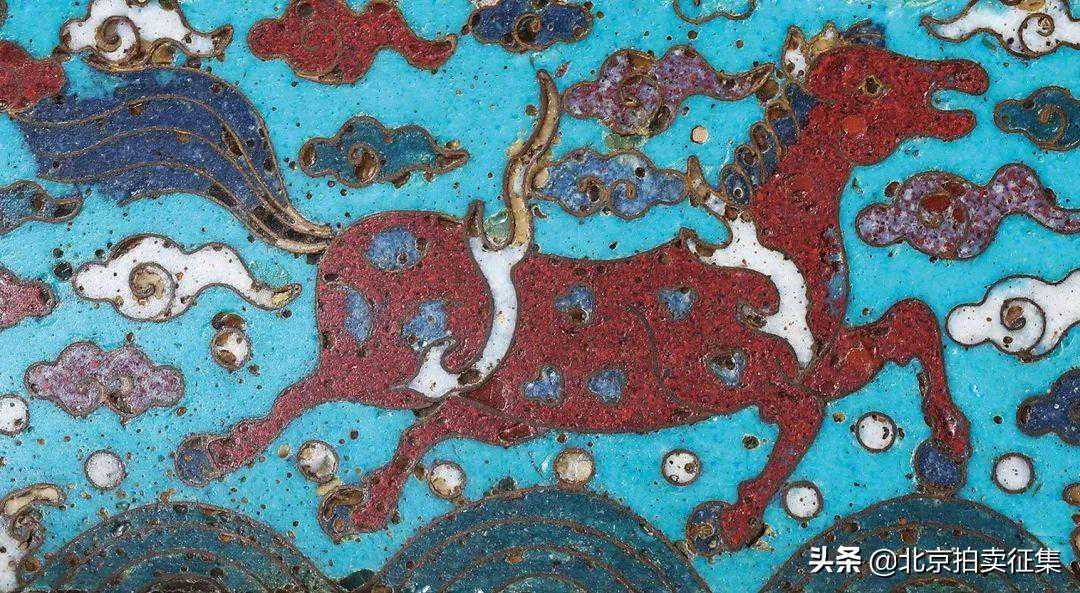 拍品造型仿自古代青铜尊,铜胎厚重,造型饱满端庄,方口、鼓腹,线条流畅,肩部对侧以高浮雕兽面衔环耳为饰,庄重威严。整器以松石绿色珐琅彩为地,颈部环饰祥云、蕉叶纹,肩部绘饰夔龙纹,颇具古意,腹部以红、绿、黄、白等多种色彩绘饰“喜鹿封猴”、“鹤寿同春”、“前程似锦”、“英明神武”吉祥美好画面,构图精妙,生气盎然,近足处以白、红、蓝彩描绘天马纹,天马姿态矫健,祥云环绕,奔腾于海浪之上。整器体量硕大,气势恢宏,工艺精湛,装饰风格端庄华美,珐琅彩纯净柔和,传世稀罕,保存至今,难能可贵。