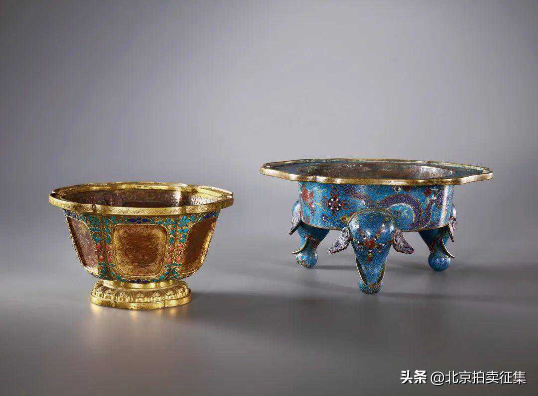 拍品一组两件,炉呈葵花形,板沿口呈葵花式,其上为缠枝莲纹,各色莲花饱满盛开,枝叶蔓延舒卷,腹部以云龙纹为饰,祥云舒卷,龙姿矫健,下承象首三足,象头上饰宝珠彩带,富丽堂皇。整器掐丝鎏金锃亮,珐琅色泽艳丽,图案布局规整,制作繁琐精美。