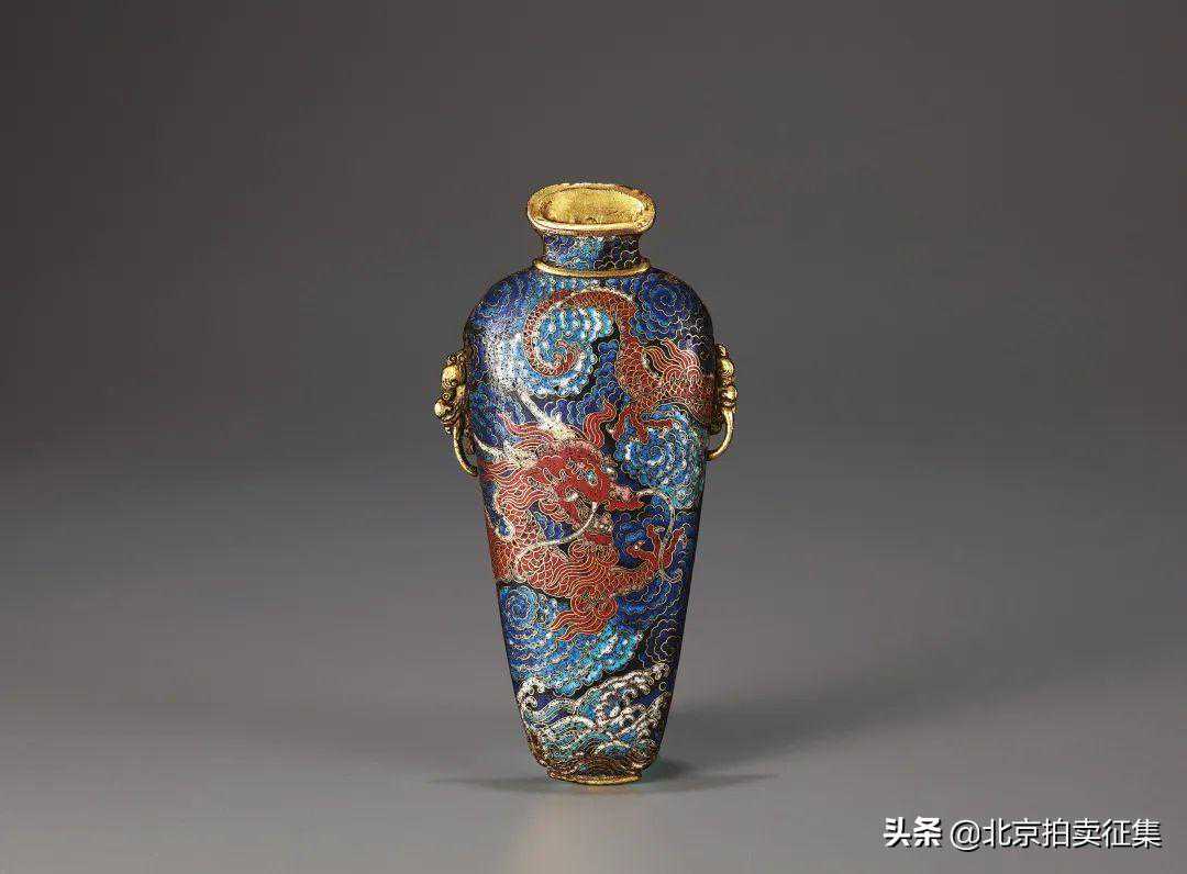 壁瓶为铜胎,口部、双兽耳鎏金,华贵灿烂,通体以掐丝珐琅装饰云龙海浪纹,祥云舒卷,海浪翻腾,龙形威猛矫健,气势非凡。整器工艺精湛,掐丝流畅,珐琅色泽饱满艳丽,给人雍容华贵之感。