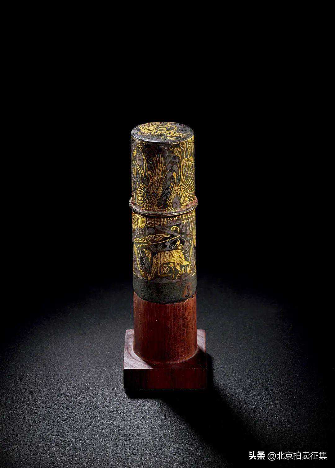 此件伞箍应为汉代车马构件之一,究其造型、纹饰,或为车上铜伞顶首,整体呈圆柱形,中央有环形箍,造型古朴秀巧。全器通以错金银为饰,顶端饰猛虎,外壁妆点孔雀,翎羽灿烂,姿态生动,色彩鲜艳,繁而不乱,富丽华贵。江西海昏侯墓出土有错金银当卢,其上虎纹、孔雀纹于拍品如出一辙,可资参阅。