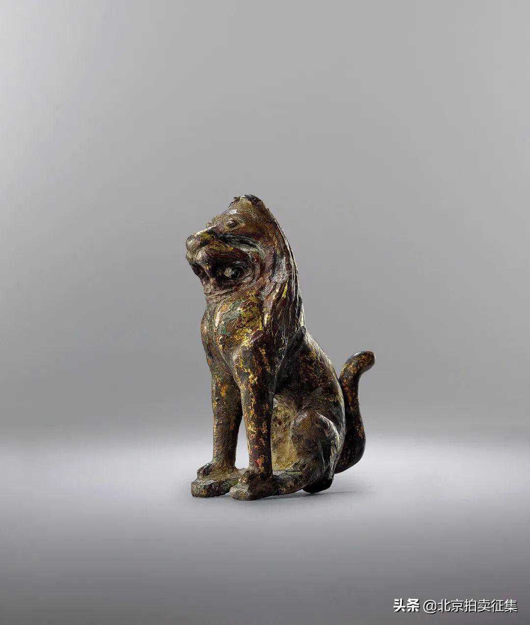 拍品为铜胎圆雕狮子,体态壮硕。狮子呈坐姿回首状,后腿弯曲蹲坐,前腿斜伸抓地。双目圆睁,两耳竖起,宽鼻阔口,长尾上翘。狮身线条刚劲有力,简练生动,线条浑厚有力,造型生动逼真,尽显狮子作为兽中之王的神韵,威武雄壮,弥足珍贵,极富唐代雕塑时代风格。