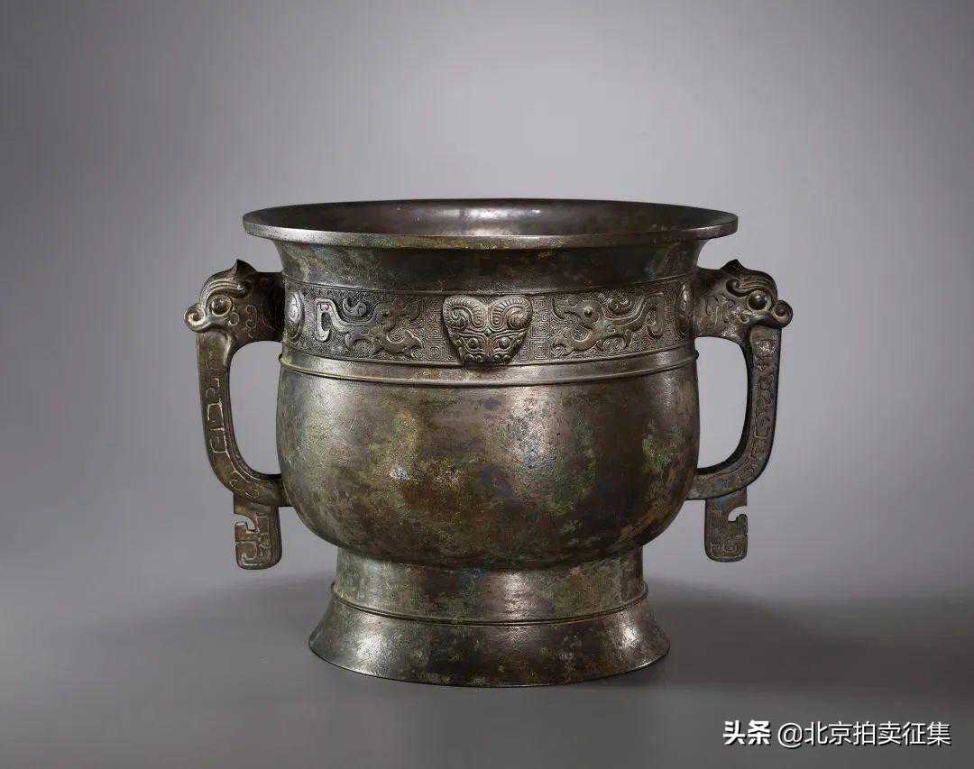 清代仿古之风盛行,内廷搜集所藏青铜器,编成《西清古鉴》与《宁寿鉴古》等谱录类图书,引领一代好古风潮。此炉型仿商周时“簋”,侈口,束颈,深直腹,胫部折收,平底,圈足。颈腹部饰以夔龙双耳,突额暴目,翘鼻张口,更显庄严肃穆,弯曲有度,灵活而富有动感;外壁颈部浮雕一圈皮球花兽面龙纹,空白处细刻规整的回纹为地,效仿商周时期的典型装饰效果,突饰兽面纹与整器古拙朴实交相呼应,其线条舒张有度,腹身光素无纹。br/整器造型硕大稳健,铜质精纯,炉壁均整,厚薄适当,炉面光亮润泽,赤光璀璨,包浆细腻温润,宝气内蕴。整体制作精湛,熔铸古今,古雅庄重,气势恢宏。
