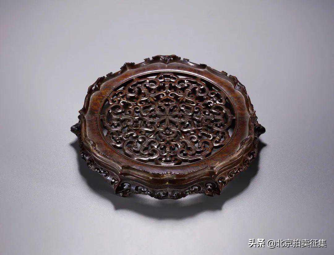 此器座以紫檀为材,质地坚硬,纹理细腻,包浆莹润。器座呈菱花状,造型极富立体感。器座中心镂雕如意云纹,线条柔美,婉转流畅,极富装饰性。侧身同样以镂雕装饰如意蝠纹,下承如意形足。整器气韵流畅,雕镂精细华丽,极富形制美感,颇有清代文人之审美意趣。