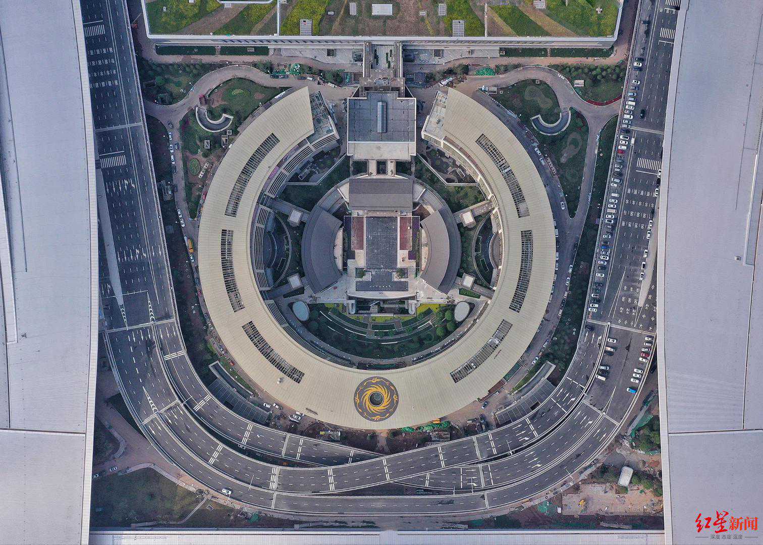 值得注意的是,该酒店由两部分构成,机场中轴线穿过的部分空出了约50米宽的空隙。在圆形建筑南侧空中8层建有一条连廊,这个中央连廊被命名为“天府之眼”。作为酒店的标志性建筑,“天府之眼”跨度约60米,宽度约24米,位于距地面近30米的高空,面向停机坪一侧。
