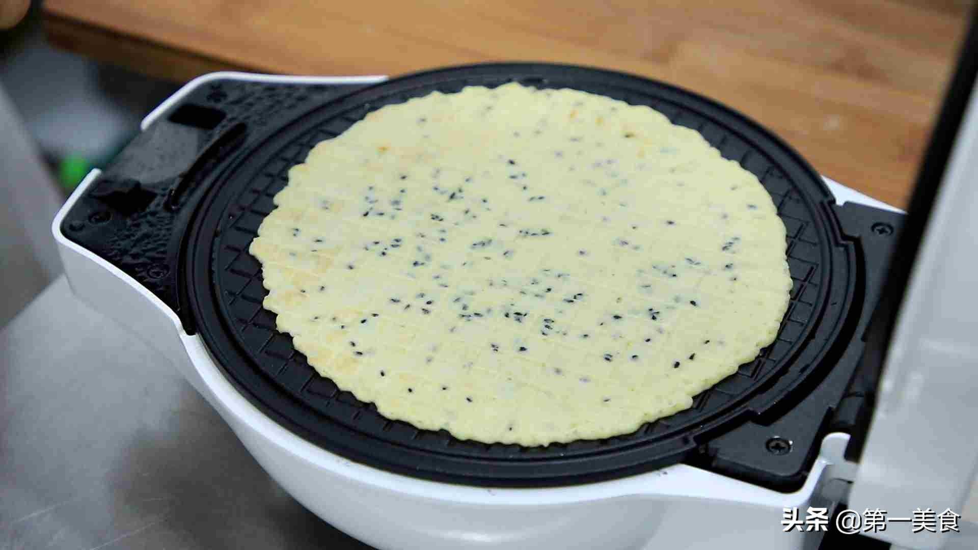 3.取出电饼机通电加热,舀一勺子鸡蛋液倒在电饼机的中间位置,盖上盖子鸡蛋液自会压平,电饼机两面加热一分钟左右,鸡蛋卷就变成金黄色。
