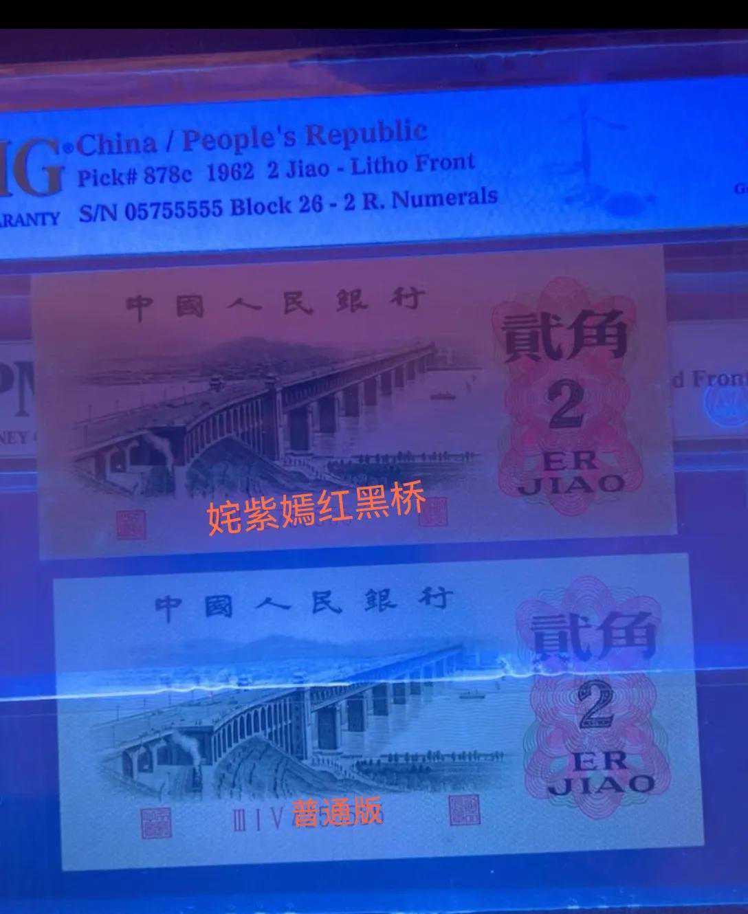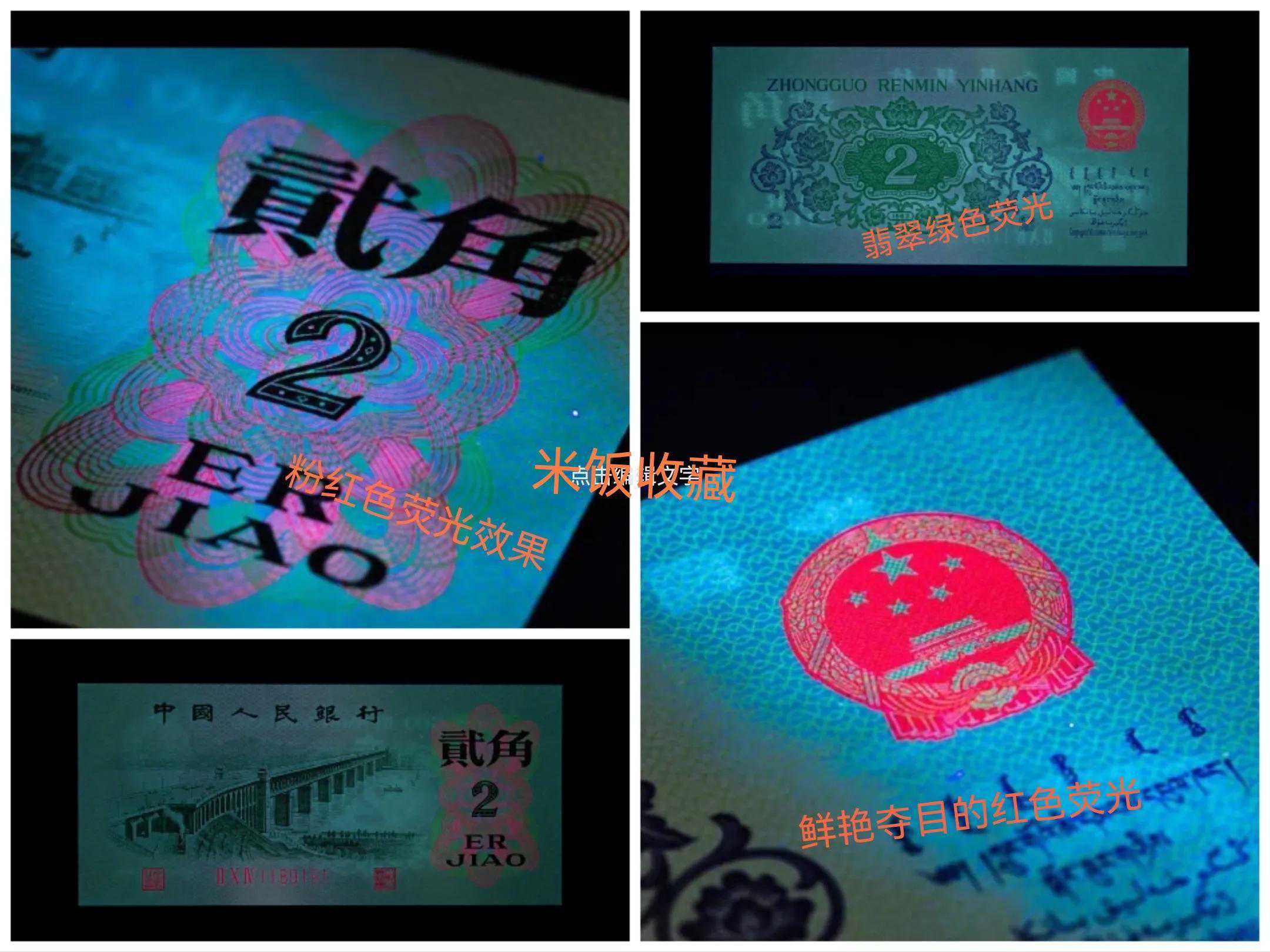姹紫嫣红2角币在荧光灯下冠号、号码及印章为红色荧光;背面右上方图案呈现红、黄色荧光,非常鲜艳。姹紫嫣红四字无尽地凸显其版别特征,五彩缤纷,正面油墨的透印效果极其明显。荧光纸张为暗灰色,呈现效果,如下图,但是真的会开标吗,现在只是传言,未来有待证实[灵光一闪]