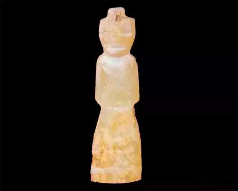 玉翁仲一般雕成文人形象,尺寸不大。整体呈扁担形为半圆雕,着长袍伫立状,头顶有长发髻,前低后高。脸长,表示出两眼一嘴,没有鼻子。五官刻画简单,只用一道短粗阴线表示,感觉像“汉八刀”的雕刻技法,刀法简练,粗犷有力。