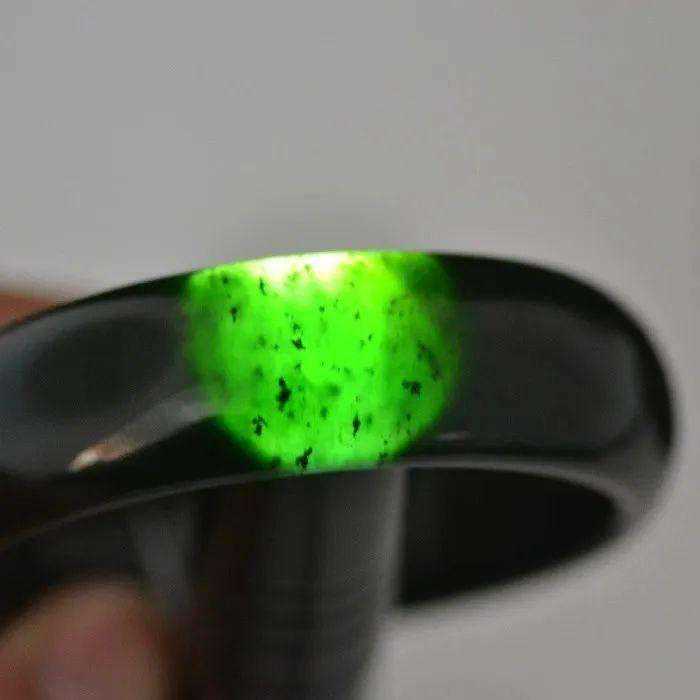 这就不得不提起黑碧玉了,它的色泽比点墨聚墨都要黑,但其本质是碧玉。虽然它在碧玉中是上品,但是不属于墨玉。在自然光下看是没什么不同,但是打灯看的话,还是能看到比较明显的绿色的,还有一个比较明显的地方就是,它透出来的光会有黑色墨点儿。