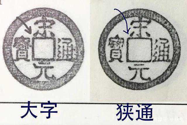 狭通版除了“宝”字和“通”字比较狭瘦以外,“宋”字的左点没有伸展到穿口左边缘,从上图与大字版的“宋”字比较可以看出微小的差异。同样背面也有星标,月标,角月标,直纹等符号标记。