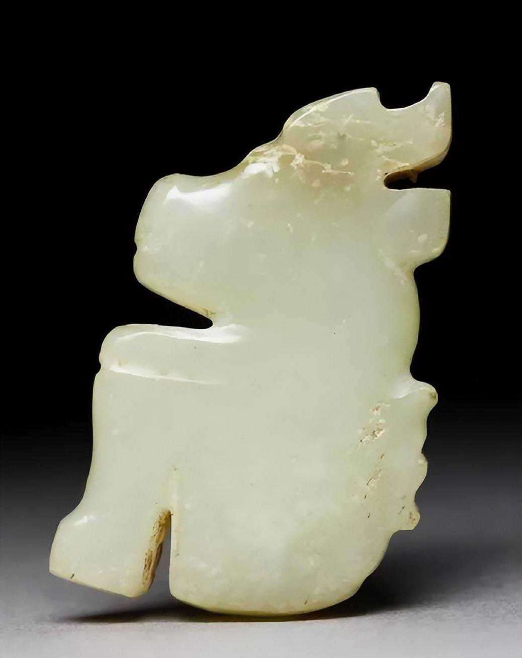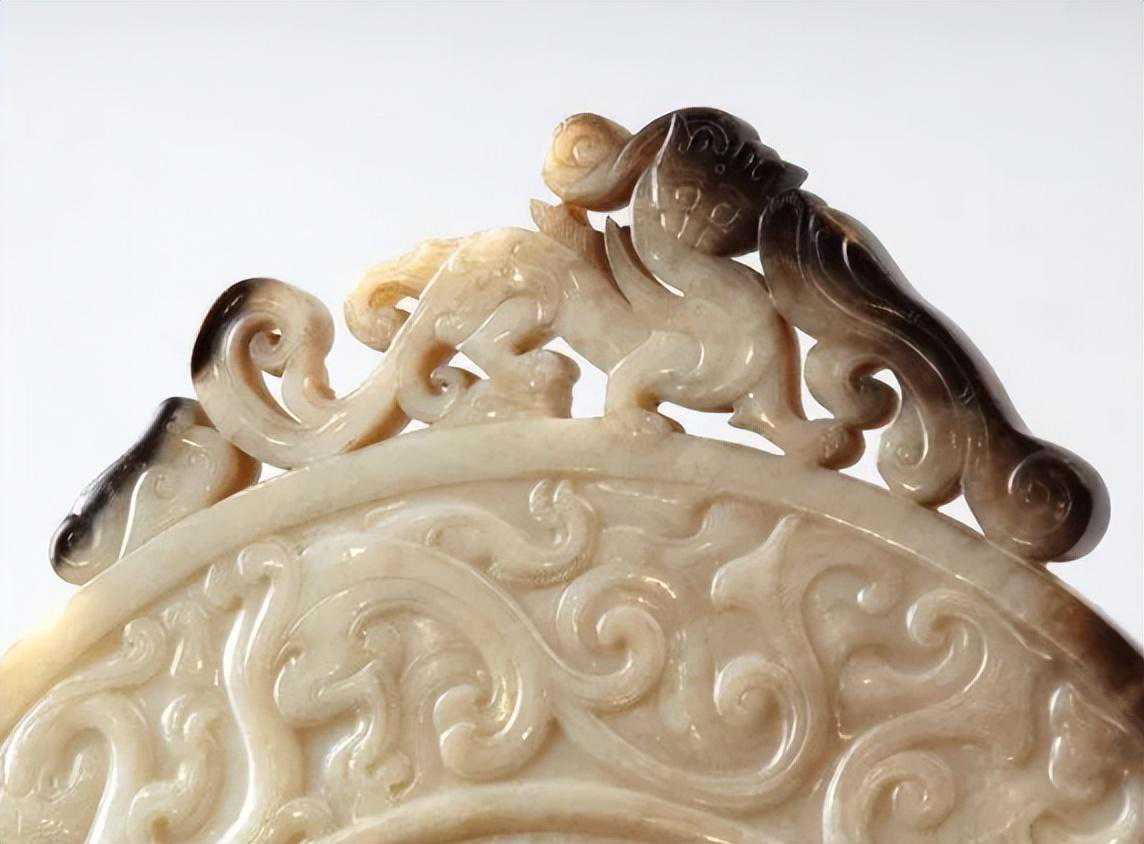 东汉龙纹玉璧19.5厘米。全璧白化沁色严重,古玉形态十分明显。上出廓璧是汉代的主要特征,战国时期的出廓璧是以两侧出廓为主。全璧分两区,内是乳钉纹,颗粒饱满,排列齐整,外区部分是四条蜿蜒秀丽的龙纹,龙首已经具有了我们今日较为熟悉的龙的形象的雏形,这使我们对螭向龙的演变寻找到了某种依据。出廓部分的螭虎活泼可爱,但是已经分离出的羽翅,则稀见于战汉时期的玉雕制品中,这又是一个新的观察点。总之,同是汉璧但没有了太多战至西汉时的威猛张扬之感,而多了几分柔和的情趣,从此以后,中国的古玉进入了一个漫长的退化历史区间。