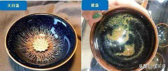从胎质上比较,建盏质感厚重,露胎处手感粗,而天目盏胎质细腻,釉色变化多样。