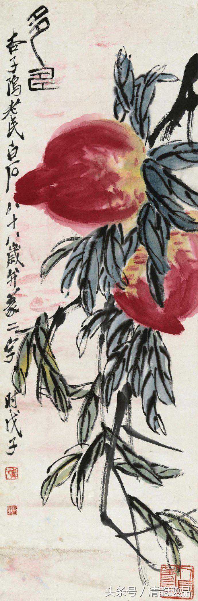 齐白石衰年变法,多取法老缶吴昌硕;但这取法又不是简单的模仿,而是笔墨精神。他自己说:“我是学习人家,不是摹仿人家,学的是笔墨精神,不管外形像不像。”其中尤以画桃极为神似。齐白石画桃,先以没骨大写意法直接用洋红泼写硕大桃实,渗以少许柠檬黄,再以花青、赭墨写出叶子和枝干,后用浓墨勾勒叶筋,设色浓重艳丽。与其画荷花所创的红花墨叶恰成强烈对照。不仅桃实的分布颇具匠心,极臻疏与密、藏与露之妙,即寿桃的向背光都以颜色的变化来确切地表现出来。