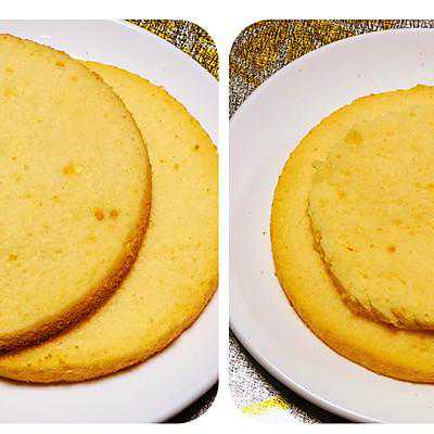 1、切两片戚风蛋糕,厚度1.5-2cm都可以,其中一片裁剪成四寸的大小;