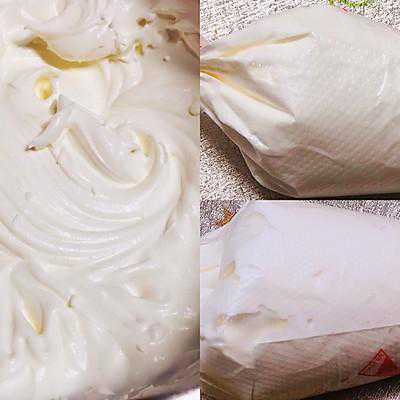2、淡奶油加糖,打发至八分发状态就可以,会有明显纹路且不易消失即可,用裱花袋分成两份,一份用来填蛋糕内馅的,一份是抹蛋糕表面,放冰箱冷藏备用;