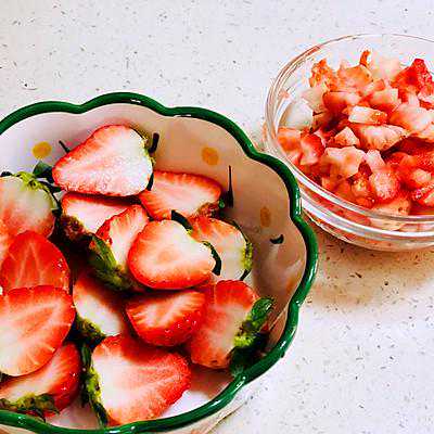 3、草莓洗净,用厨房纸巾擦干,一半切小块,一半对半切;