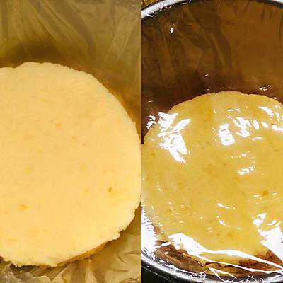5、盖上刚才剪裁好的四寸蛋糕坯片,用保鲜膜包住放入冰箱冷藏20分钟定型;