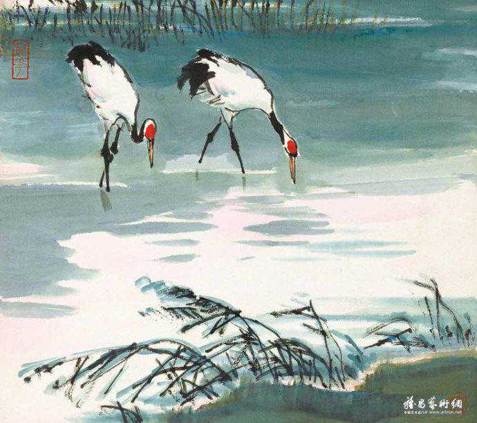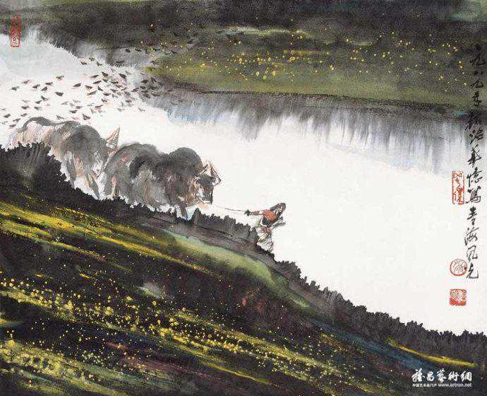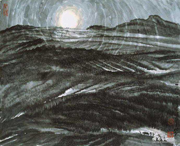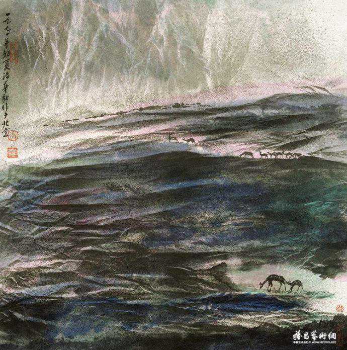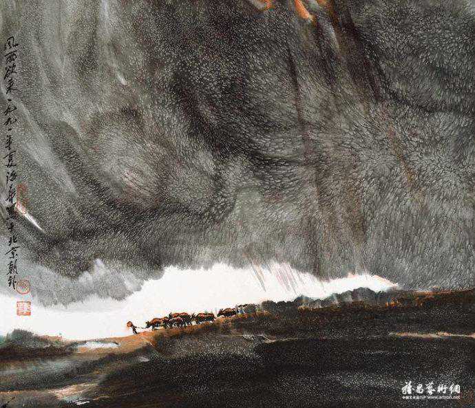 代表作《黄河颂》,此画最早版本一直挂在人民大会堂东门大厅北侧,曾有成千上万人与作品合影留念。作品奔腾壮观的气势,给每一位欣赏者带来强烈的心灵震撼。伫立画前仿如独立危岸,河涛拍岸之声直逼耳际,夹杂着扑面而来的飞溅浪花。这幅长500厘米、宽200厘米的巨型力作。